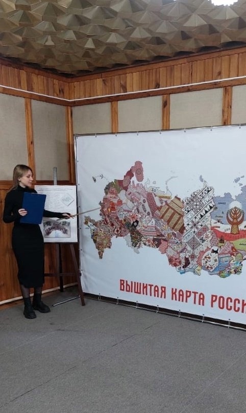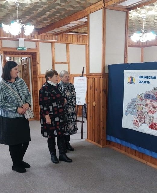 Напомним, на выставке экспонируется вышитая карта Ивановской области, созданная в рамках всероссийской акции «Вышитая Россия» в 2023 году. Карту вышивали 36 мастериц из 21 муниципалитета области. Фрагмент карты, соответствующий очертаниям Ильинского района, выполнен орнаментом, который скопирован с вышитого полотенца 1904 года из фондов Ильинского краеведческого музея. Работу выполнила Валентина Дмитриевна Можарина, участница клуба «Деловая женщина» Аньковского Дома ремёсел.