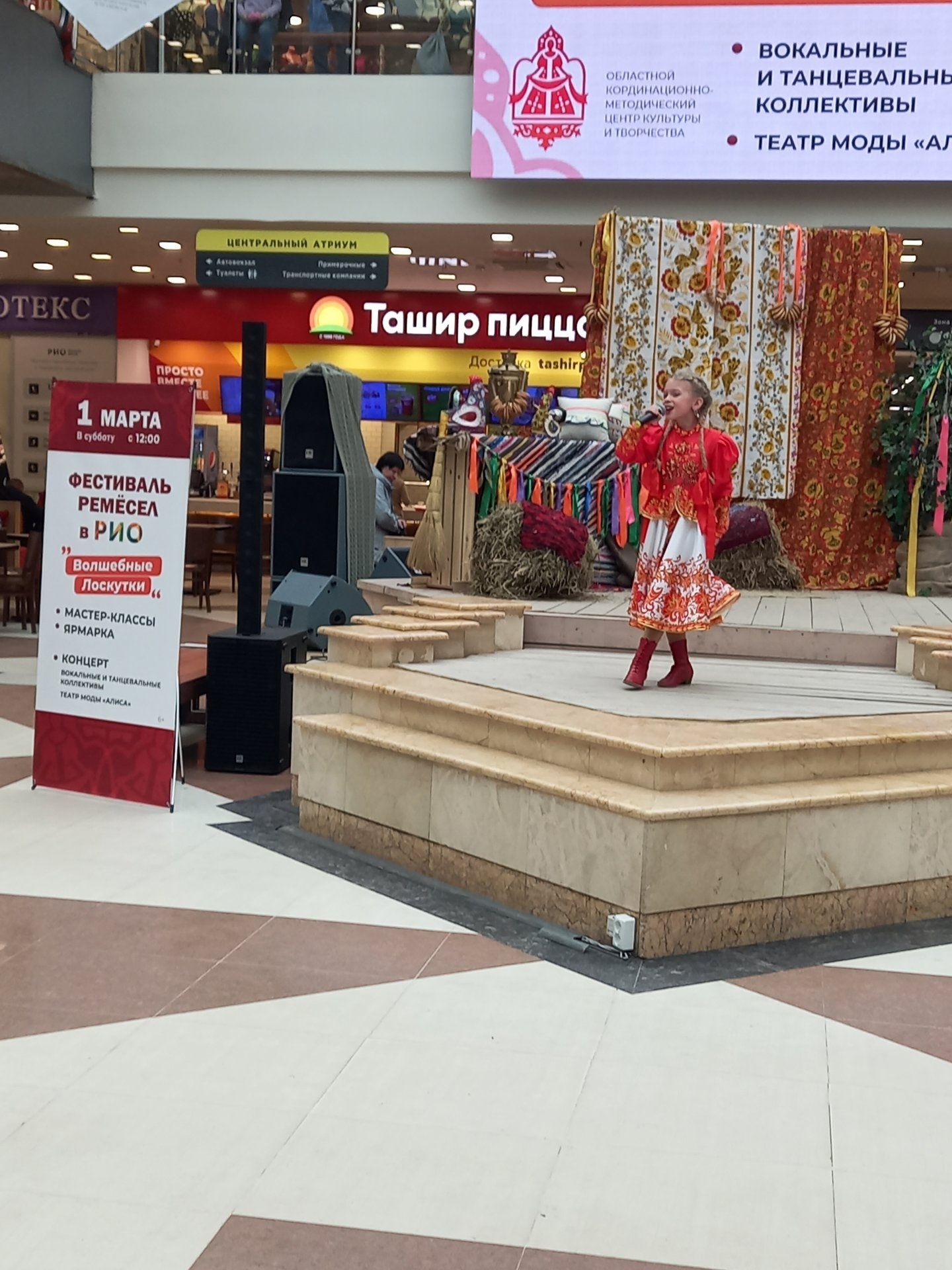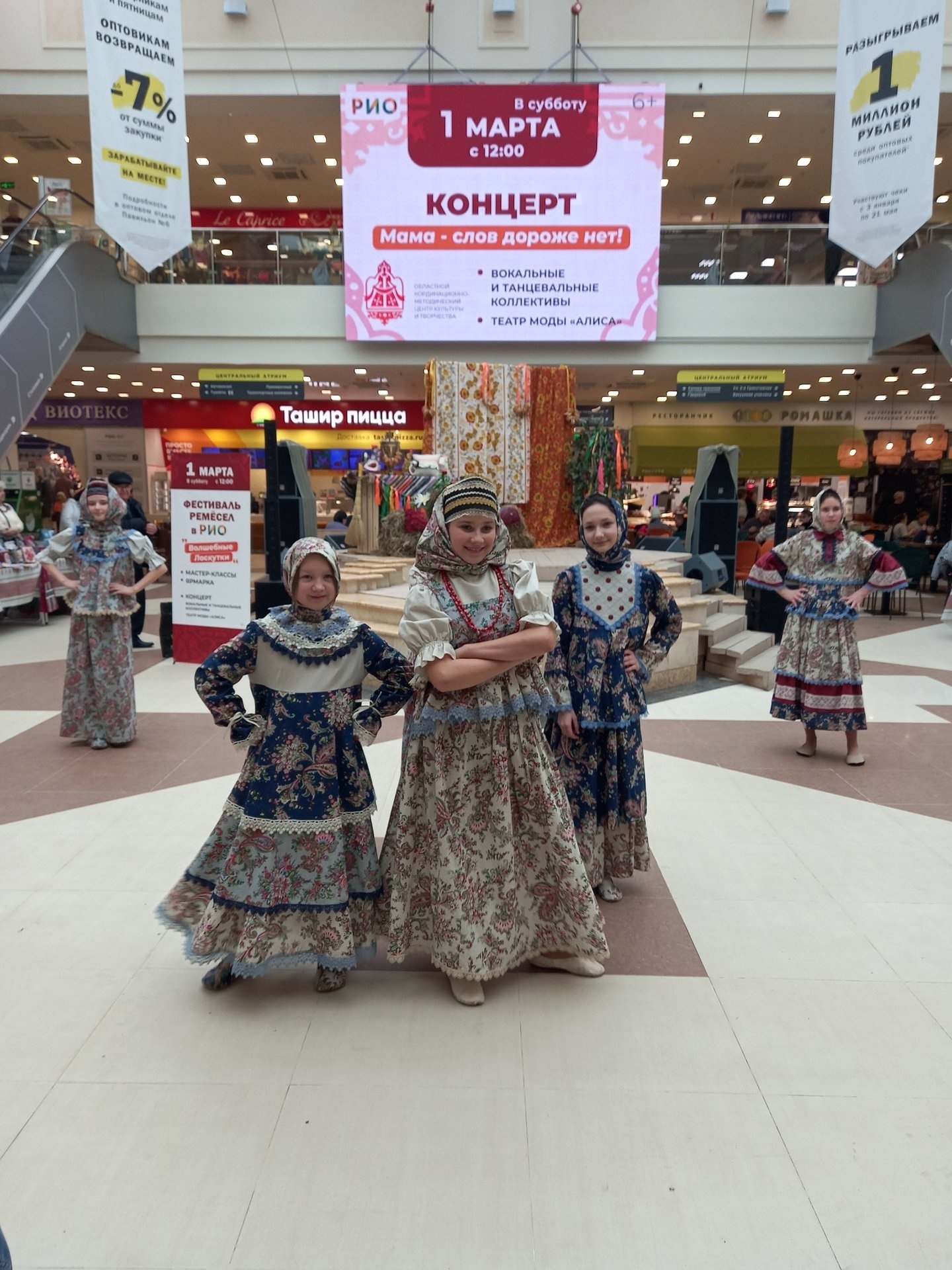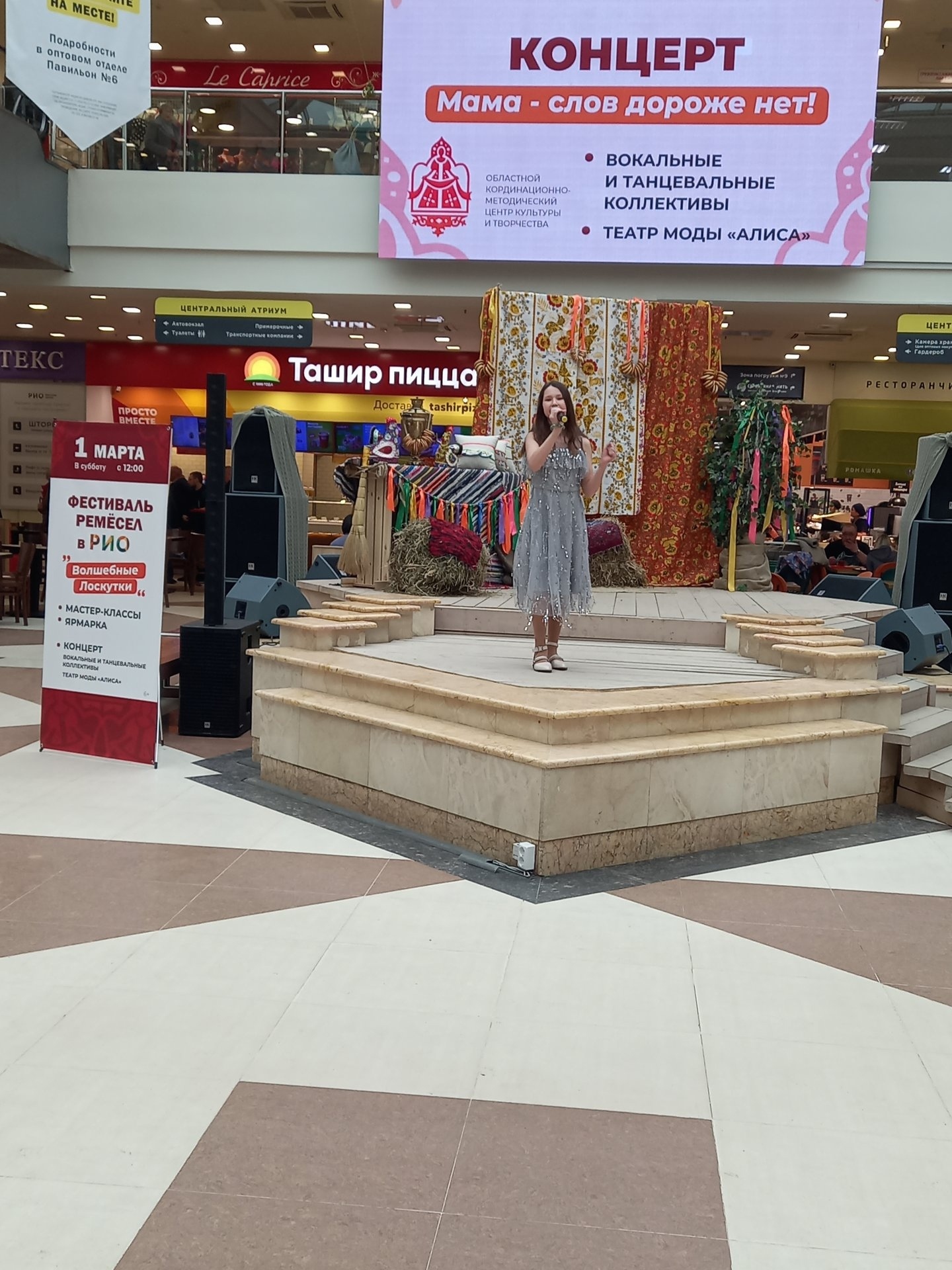 На сцене текстильного центра состоялась концертная программа, в которой приняли участие: Образцовый театр моды «Алиса», Олеся Озерова г. Шуя, солистка вокальной группы «F-R-I-E-N-D-S» Юлия Куликова и солистка вокально-эстрадной студии «А+Б» Аделина Башкурова г. Иваново. Программа концерта была посвящена Международному женскому дню 8 Марта.