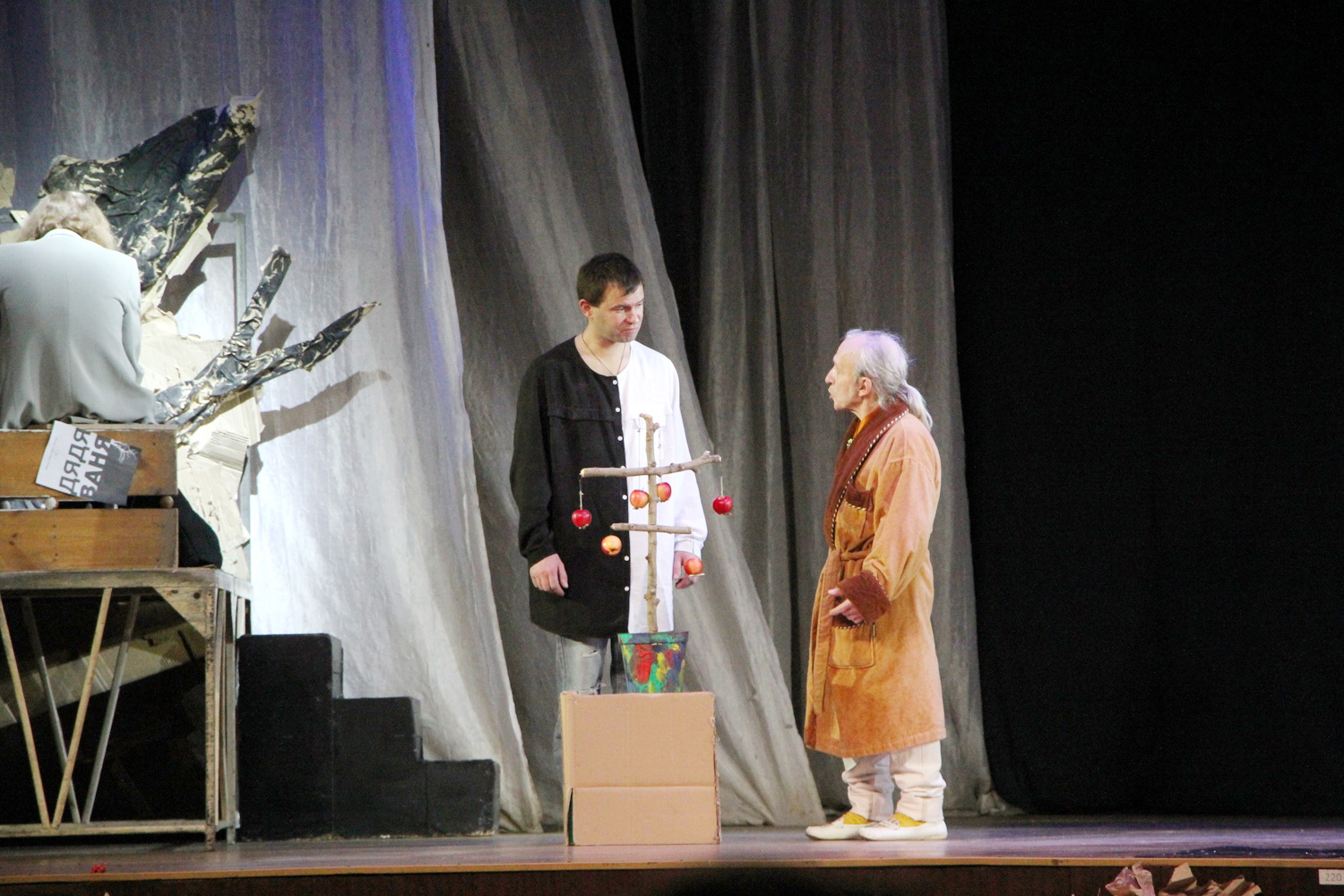 Все ли понятно в работе Е. Галкина? Далеко не все! Почему, например, герои поют «Не кочегары мы…»? Почему появляется не то дерево, не то крест с яблоками? Почему герои вдруг начинают цитировать самого Антона Павловича, вспоминая его знаменитую фразу о том, что в человеке все должно быть прекрасно?
