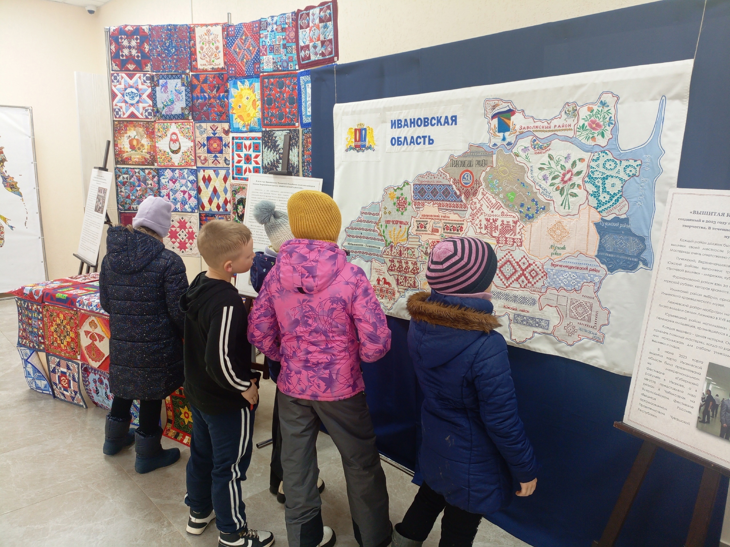 Напомним, на выставке экспонируется вышитая карта Ивановской области, созданная в рамках всероссийской акции «Вышитая Россия» в 2023 году. Карту вышивали 36 мастериц из 21 муниципалитета области. Фрагмент Ивановского района украшен орнаментом со свадебного рушника в пожелание всем ивановским невестам обрести своих женихов, а региону – крепких больше семей и повышения рождаемости. Его выполнила руководитель народного коллектива «Лоскутная мозаика» Областного центра культуры и творчества Марина Тулупова
