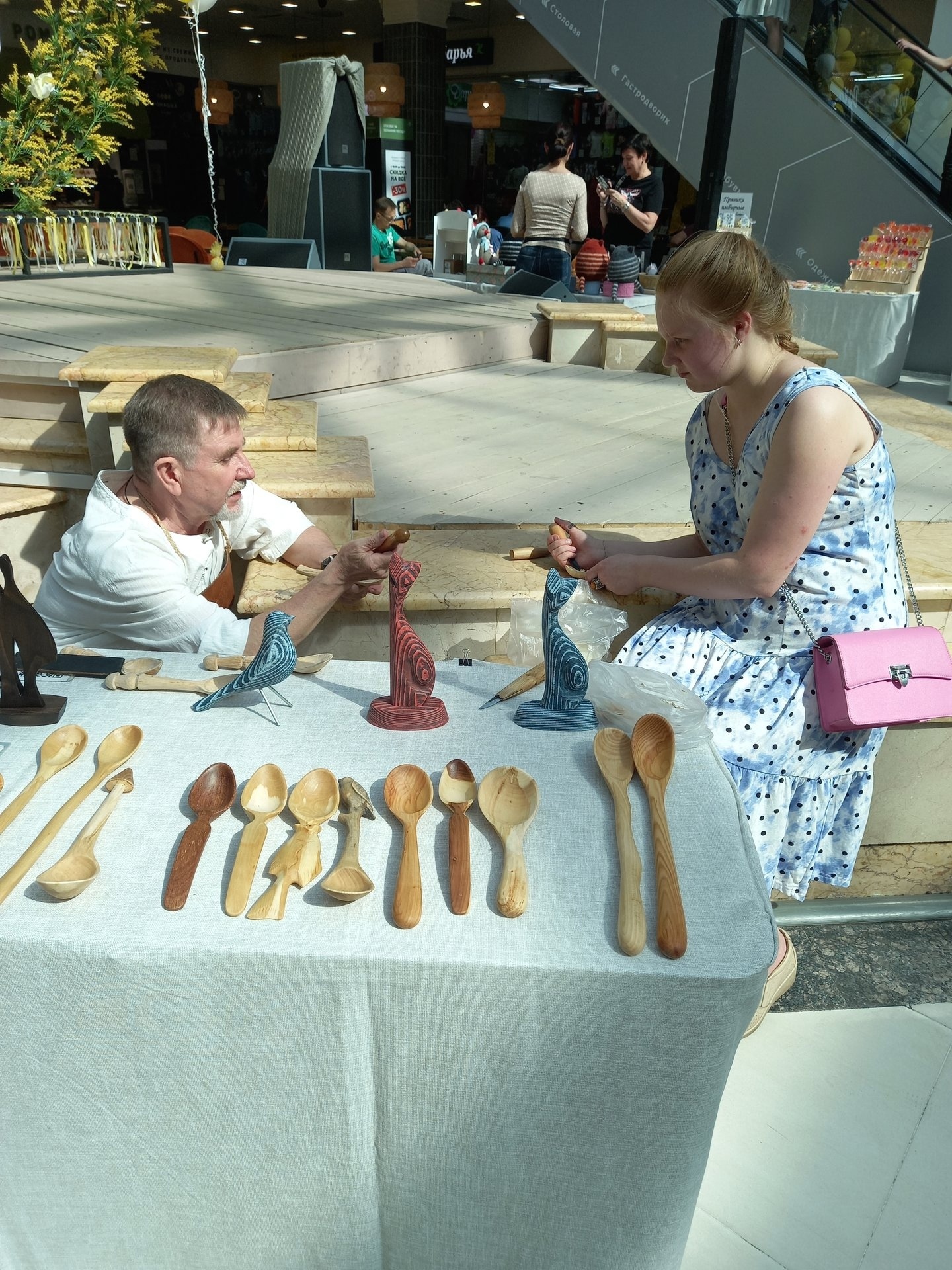 Выставка-ярмарка собрала мастеров прикладного искусства, представивших изделия ручной работы. Посетителей ожидали интересные мастер-классы: роспись имбирных пряников от Жанны Соловьёвой и резьба деревянных ложек от Александра Савельева.