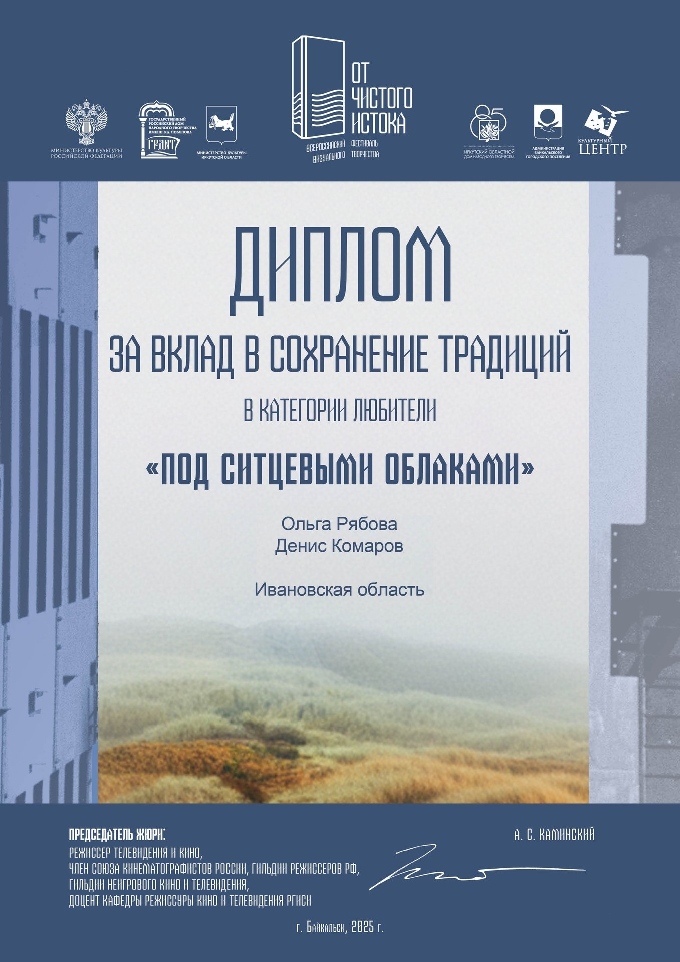 Фильм «Под ситцевыми облаками» Заслуженного коллектива России студии мод «Театр образа» (руководитель и режиссёр Ольга Рябова, оператор Денис Комаров) получил специальный приз XV Всероссийского фестиваля визуального творчества «От чистого истока» за вклад в сохранение традиций.
