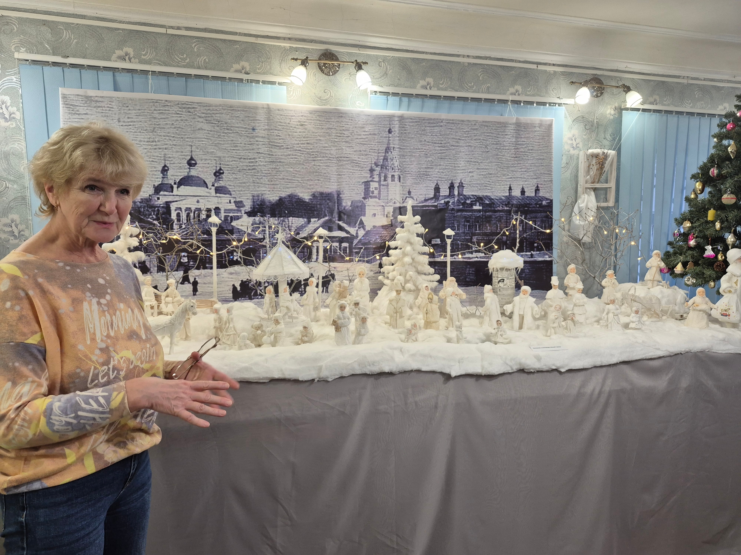 Дополняет выставку ретро-коллекция ёлочных игрушек и новогодних открыток из фондов музея Бубновых и проект «Белый город» — уголок старого Иванова с почти живыми персонажами и рождественскими уличными сценками, созданный по классической технологии ватной игрушки.