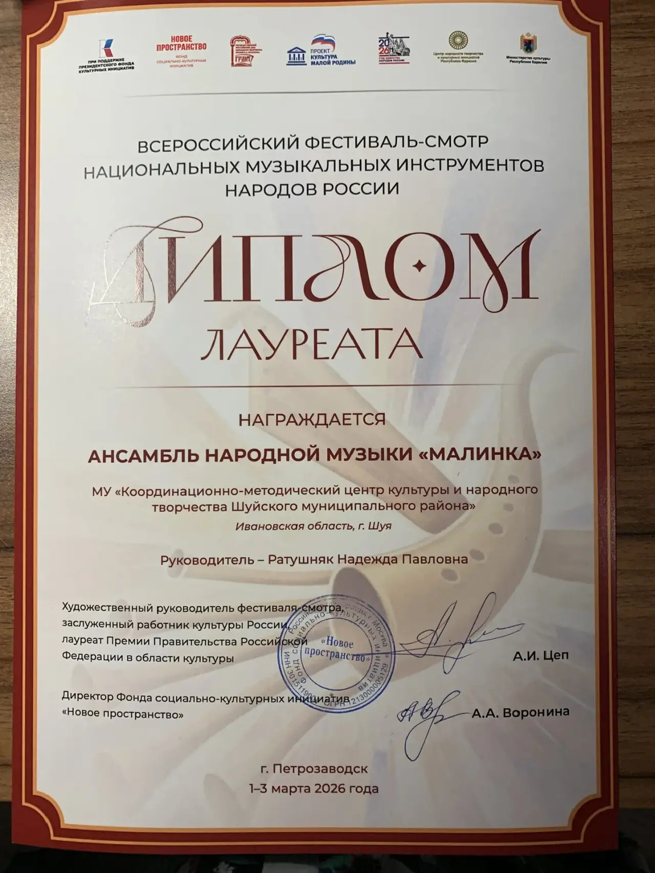 Ансамбль народной музыки «Малинка» из Шуйского муниципального района по итогам заочного этапа конкурса стал Лауреатом фестиваля смотра национальных музыкальных инструментов народов России и ярко представил свое творчество на гала концерте Фестиваля в городе Петрозаводск. Областной координационно-методический центр культуры и творчества поздравляет ансамбль «Малинка» с заслуженной наградой! Отдельное спасибо каждому участнику коллектива — за смелость, талант и искреннюю преданность народной культуре.