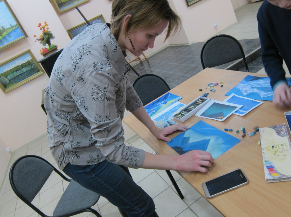 Радушно приглашала Анастасия на своей странице Вконтакте юных и взрослых любителей живописи в зал народного творчества. Заинтересовавших оказалось немало, так что первый опыт проведения субботних экскурсий можно считать удачным. Кстати, осмотром экспозиции субботняя встреча не ограничилась. Завершением стал мастер-класс от замечательной художницы Полины Барановой. Так, вместе с Полиной посетители смогли почувствовать себя настоящими творцами. Вооружившись пастелью, дети и взрослые создавали восхитительные горные пейзажи.