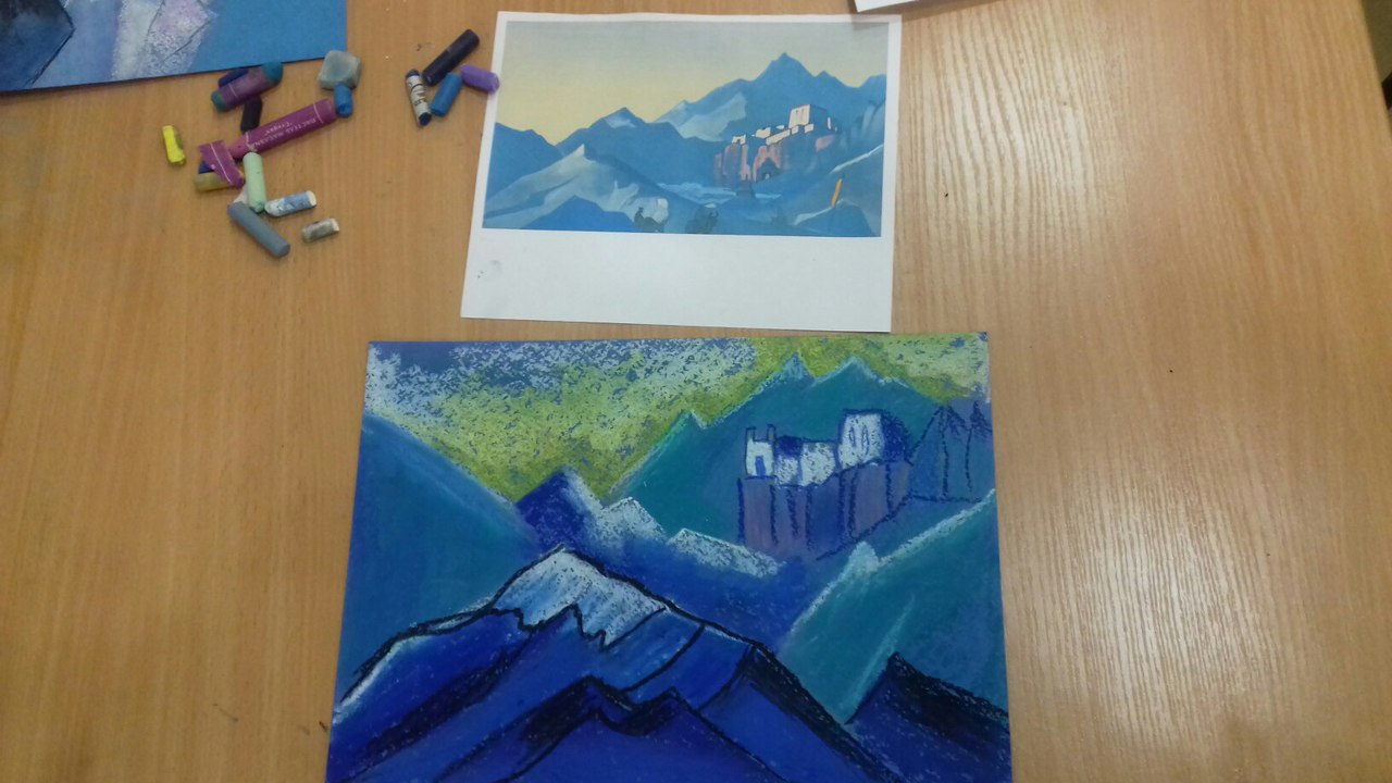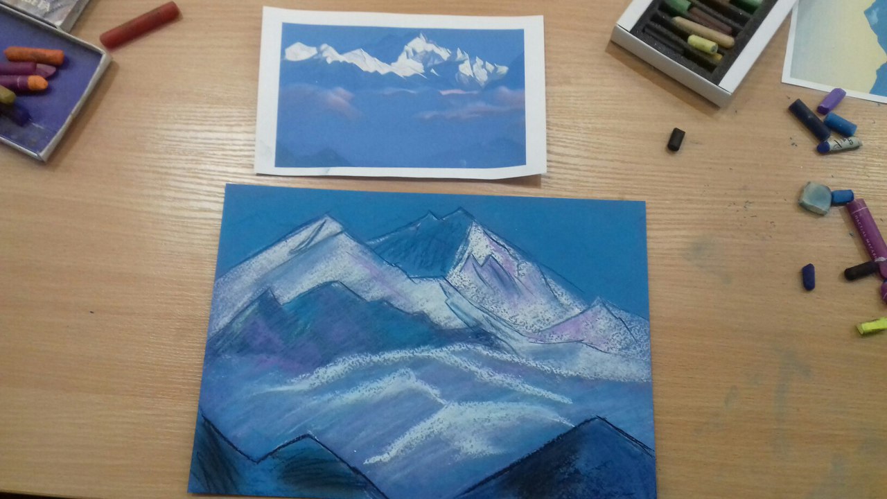 «Оказалось, что из всей компании только две сестрёнки посещают художественную студию, остальные вообще пастельных мелков в руках не держали. Однако горные пейзажи по мотивам Николая Рериха получились чудесными».