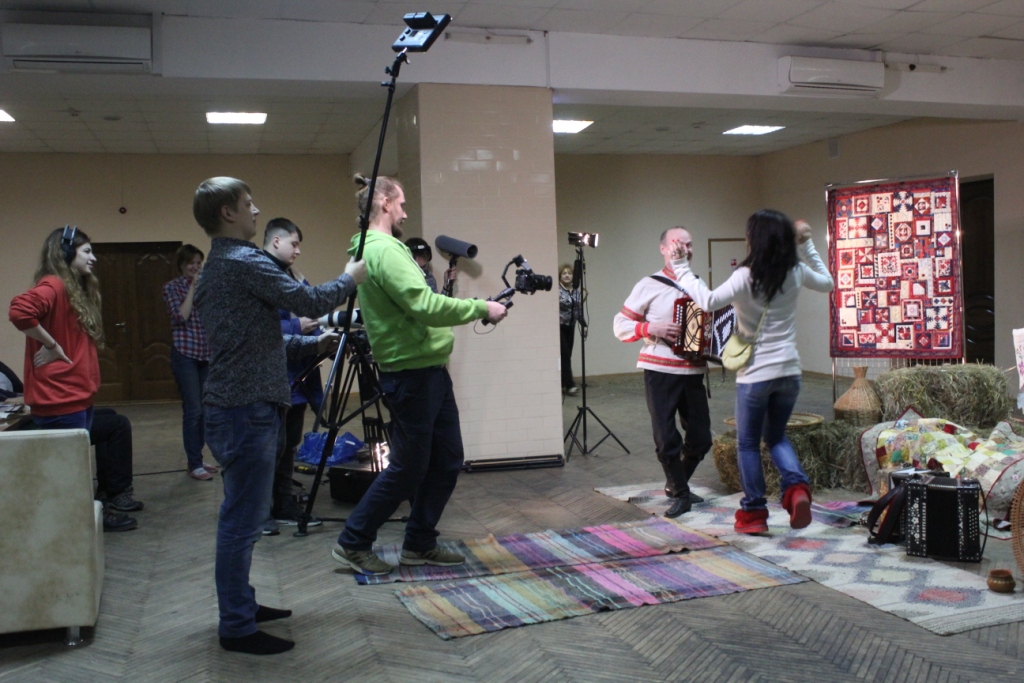 После этого съёмки продолжились в фойе ОКМЦКТ. Здесь Татьяна Герасимова пообщалась с виртуозным гармонистом из Шуи Юрием Горшковым. Многократный лауреат всероссийского фестиваля «Играй, гармонь!» познакомил московскую телеведущую с тремя разными видами гармоней, а шуйскую  - даже разобрал, чтобы показать её устройство. Съёмочная группа смогла оценить звучание каждой гармони, а под частушки, сыгранные Юрием Николаевичем на шуйской гармошке, Татьяна Герасимова задорно сплясала.