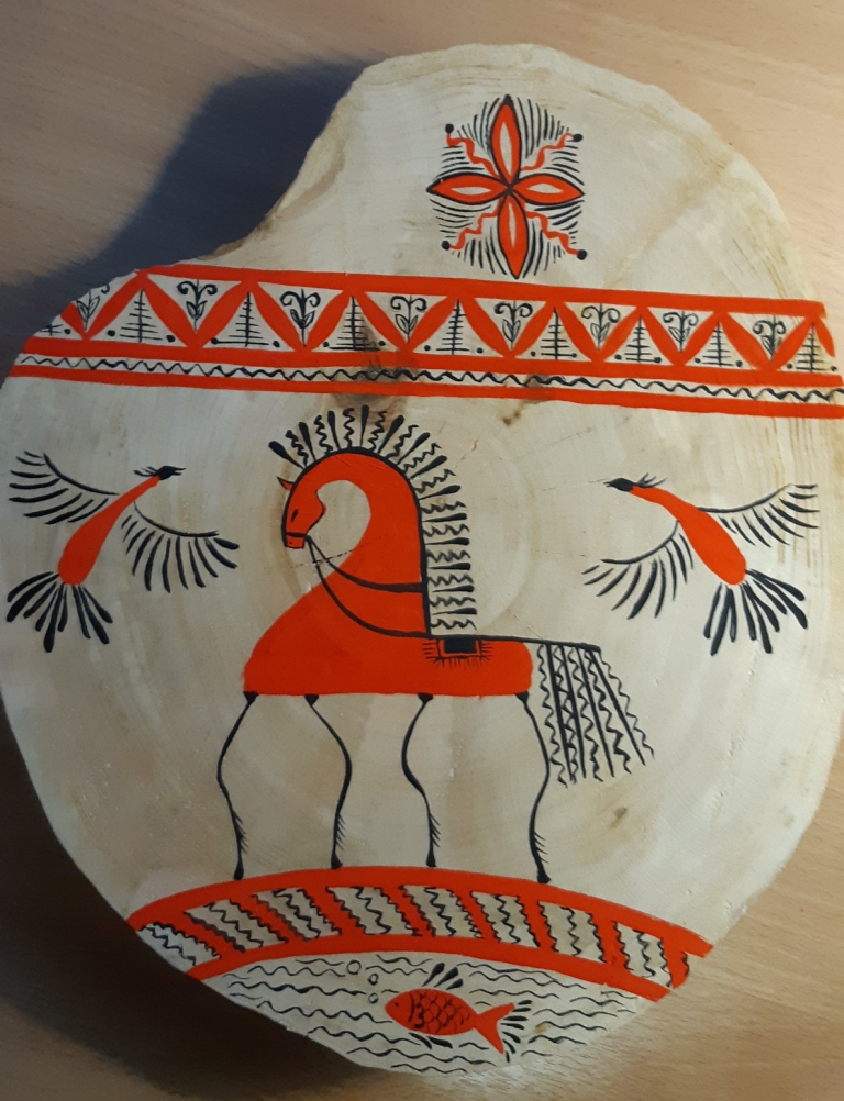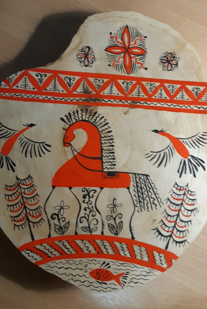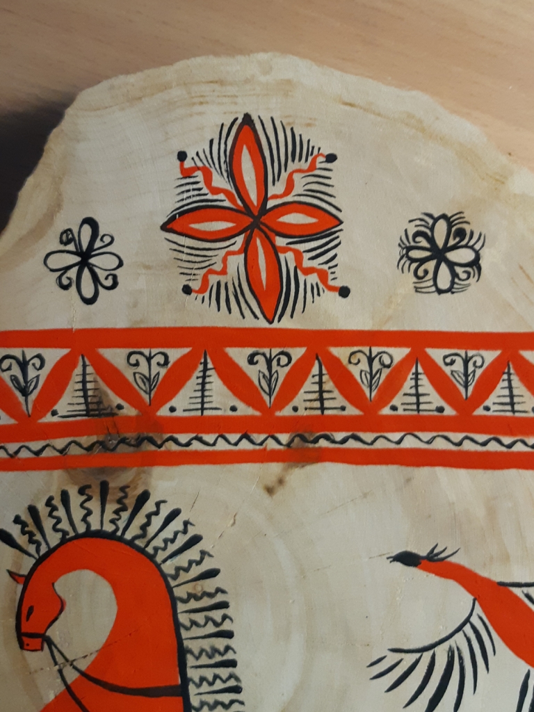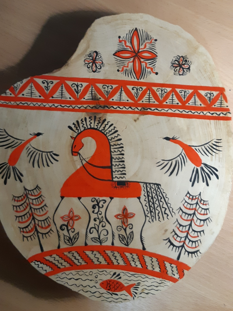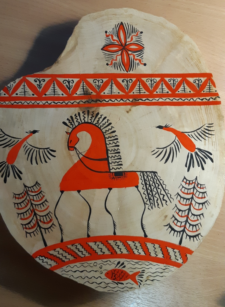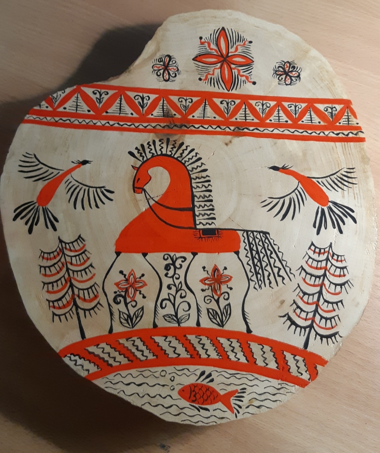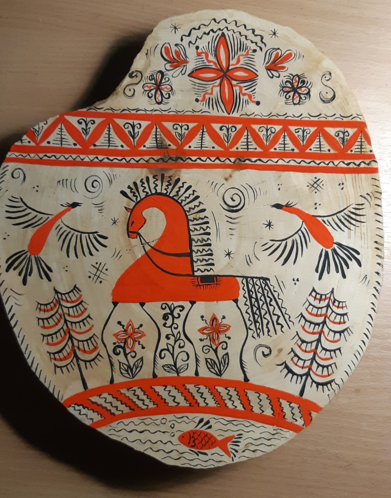 Кроме них, родных, очень люблю мезенскую. Этот тип народной росписи зародился в низовьях реки Мезень и использовался для украшения домашней утвари. Элементы её похожи на наскальные изображения, встречающиеся в этих местах, в ней явно прослеживаются архаичные корни. Немногоцветная, условная, она несёт в себе отпечаток суровых реалий края. В мезенской росписи меня завораживает то, как неожиданно в этой чёткой орнаментальности и немногоцветии передаётся динамика: стремительный бег коней, полёт птиц, движение стихий. Поистине волшебно…"