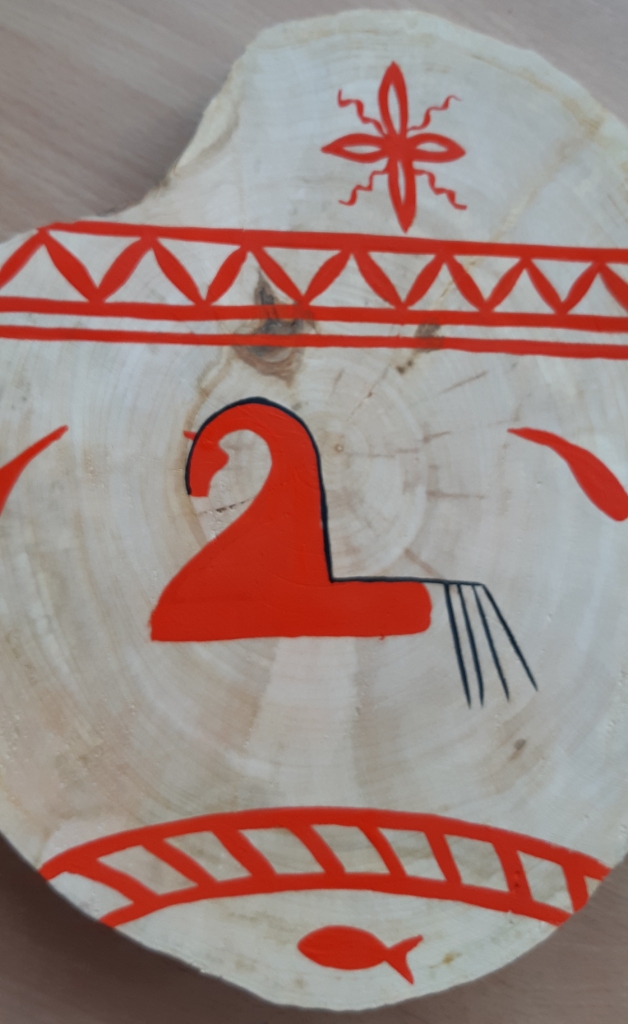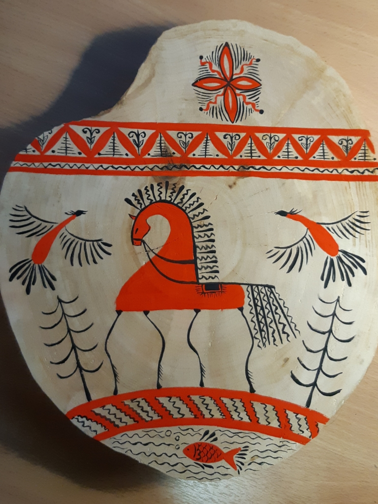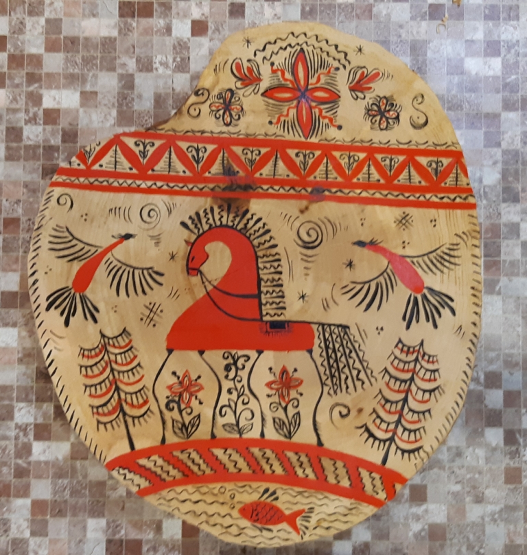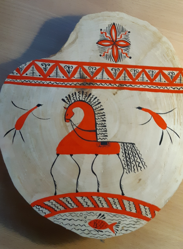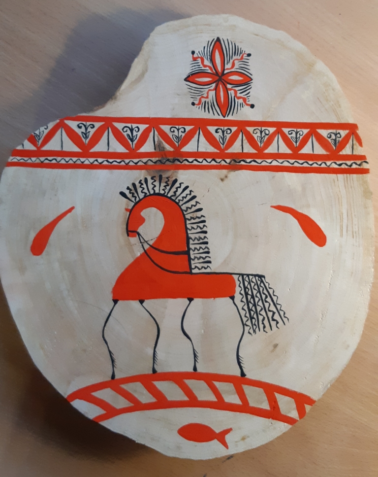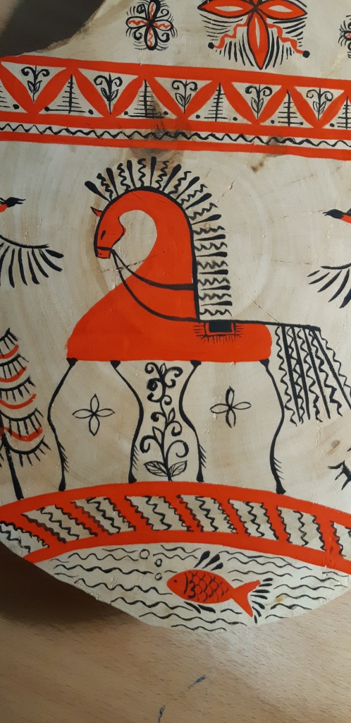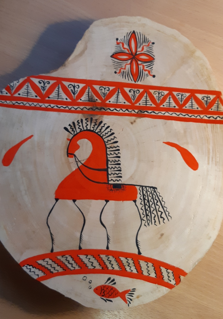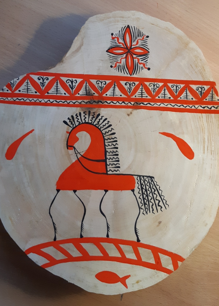 Кроме них, родных, очень люблю мезенскую. Этот тип народной росписи зародился в низовьях реки Мезень и использовался для украшения домашней утвари. Элементы её похожи на наскальные изображения, встречающиеся в этих местах, в ней явно прослеживаются архаичные корни. Немногоцветная, условная, она несёт в себе отпечаток суровых реалий края. В мезенской росписи меня завораживает то, как неожиданно в этой чёткой орнаментальности и немногоцветии передаётся динамика: стремительный бег коней, полёт птиц, движение стихий. Поистине волшебно…"