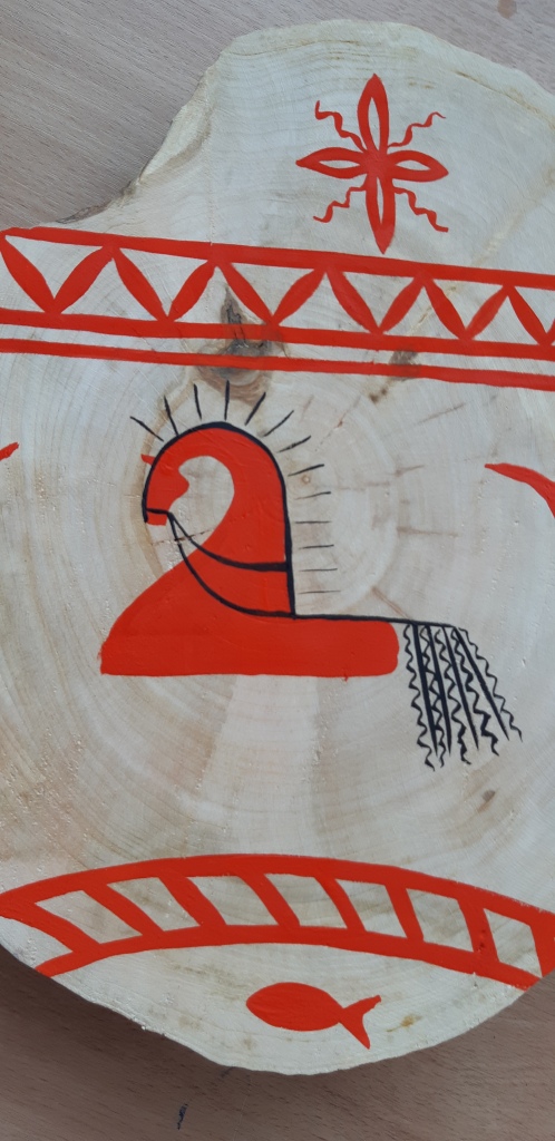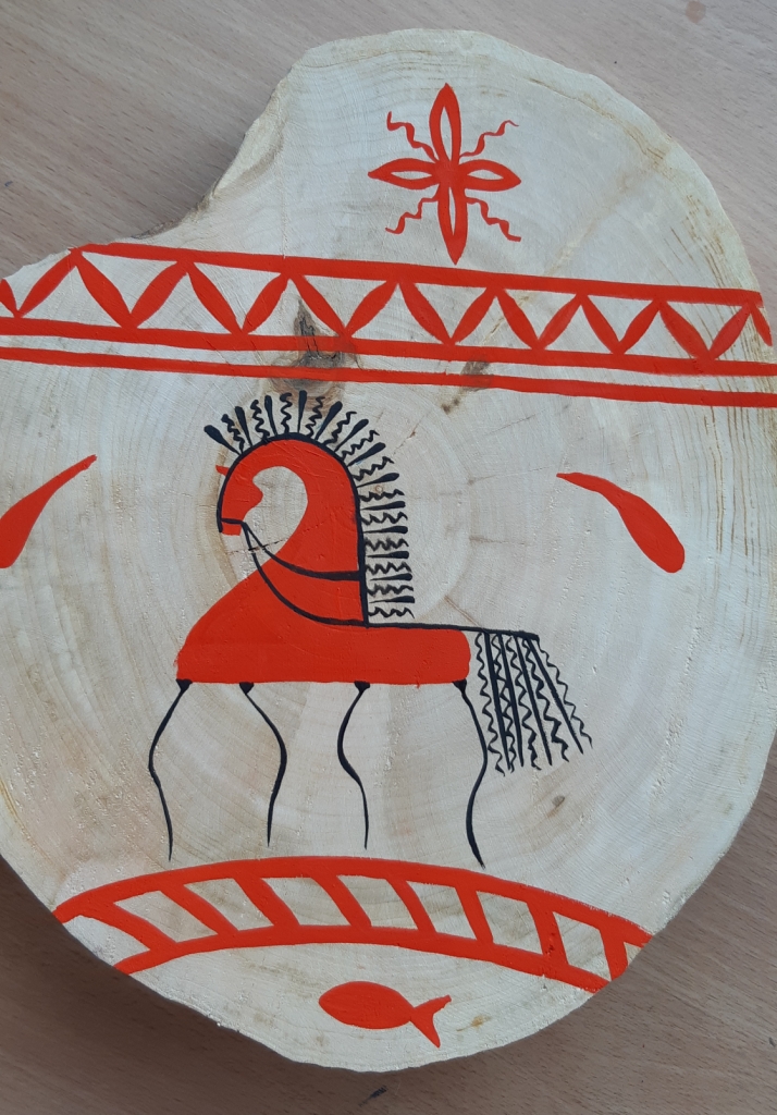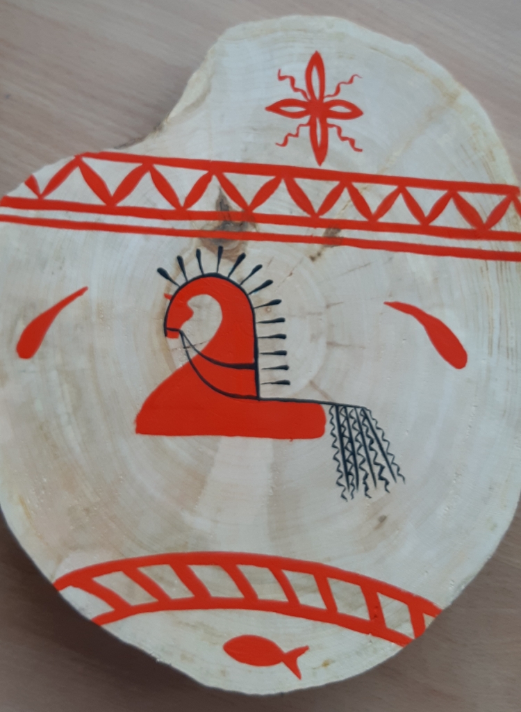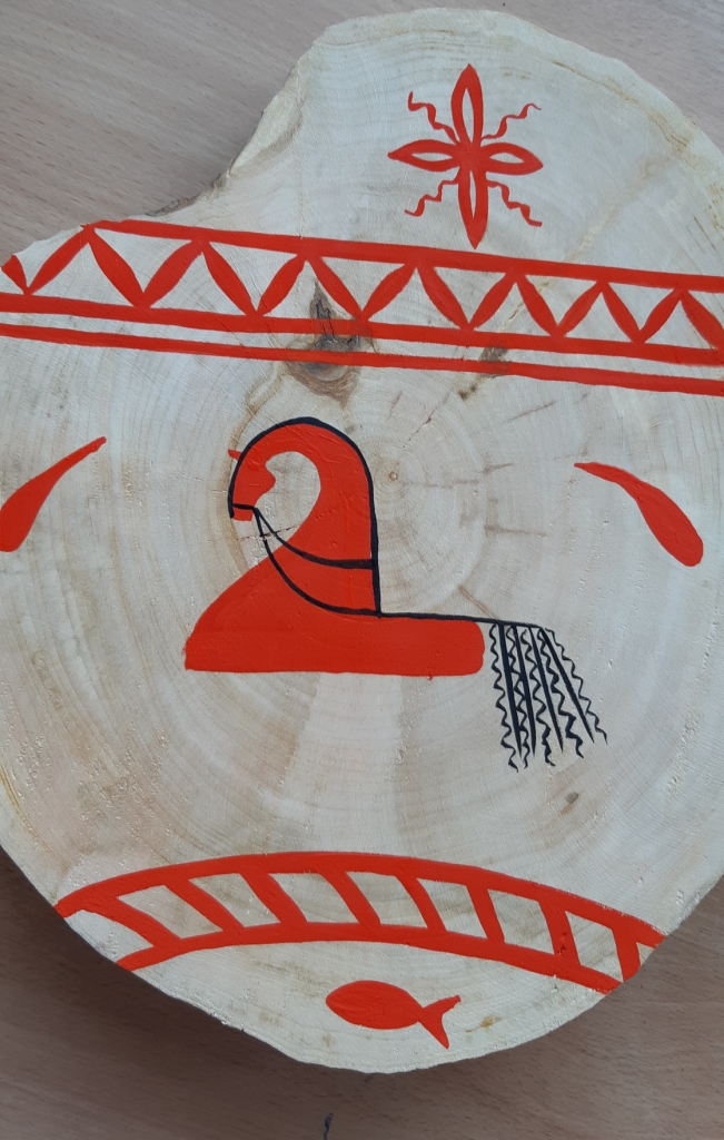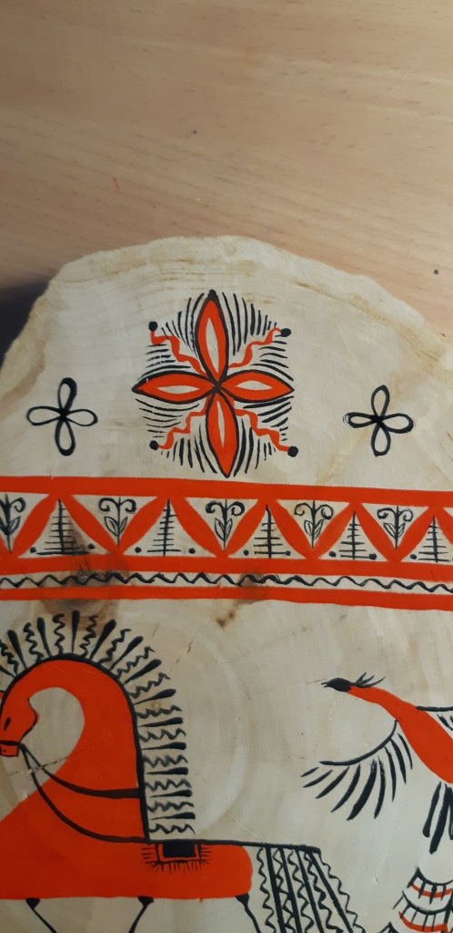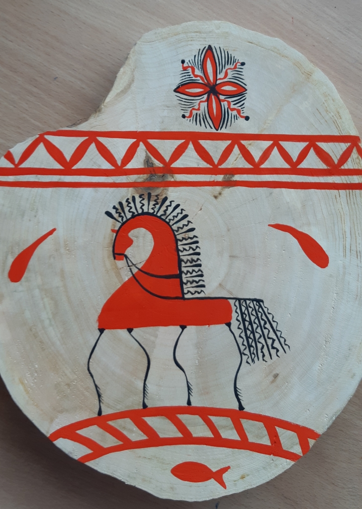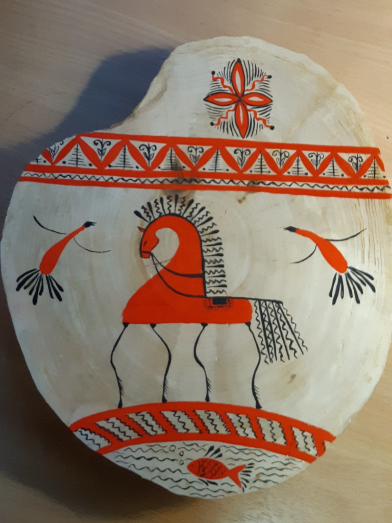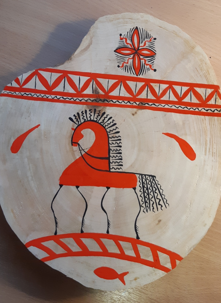 Кроме них, родных, очень люблю мезенскую. Этот тип народной росписи зародился в низовьях реки Мезень и использовался для украшения домашней утвари. Элементы её похожи на наскальные изображения, встречающиеся в этих местах, в ней явно прослеживаются архаичные корни. Немногоцветная, условная, она несёт в себе отпечаток суровых реалий края. В мезенской росписи меня завораживает то, как неожиданно в этой чёткой орнаментальности и немногоцветии передаётся динамика: стремительный бег коней, полёт птиц, движение стихий. Поистине волшебно…"