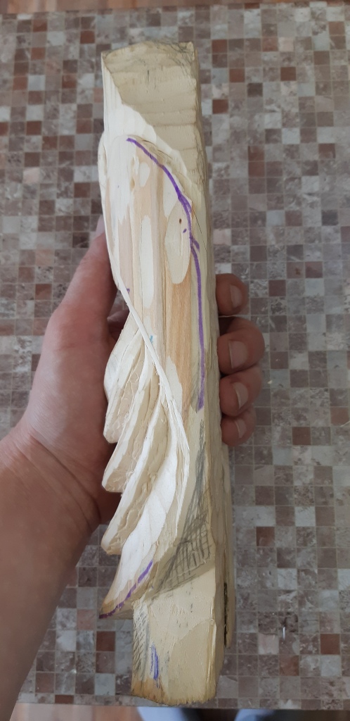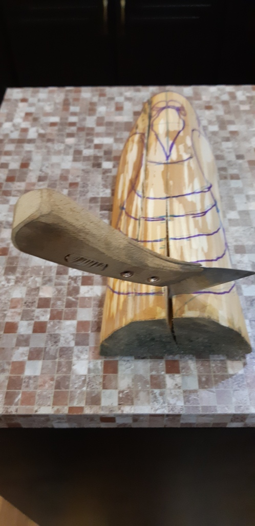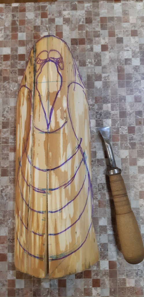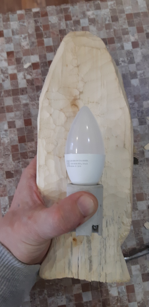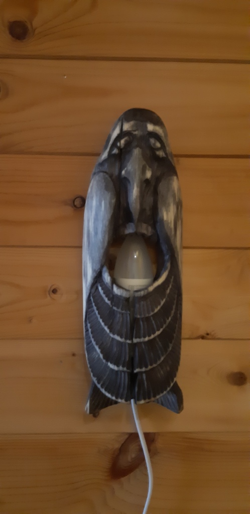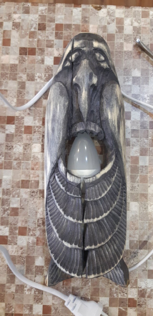 Для работы нужны: липовый сучок, пара острых ножей (специально использовал минимум: две полукруглые стамески - большую и маленькую - и два «косяка» - большой и маленький), карандаш, наждачная бумага, морилка водная, лак аэрозольный, а также старая разделочная доска или кусок фанерки - это почти самый главный инструмент «кухонного» резчика. В моём случае ещё понадобилась арматура от старого, пришедшего в негодность светильника. Но и в качестве просто настенного панно ворона смотрится неплохо.