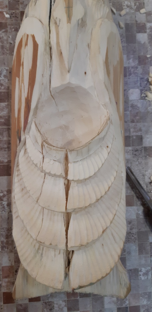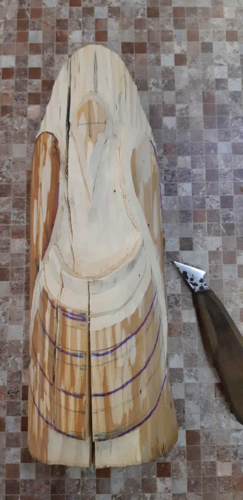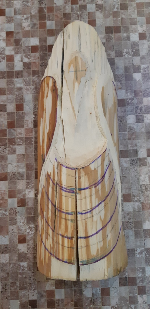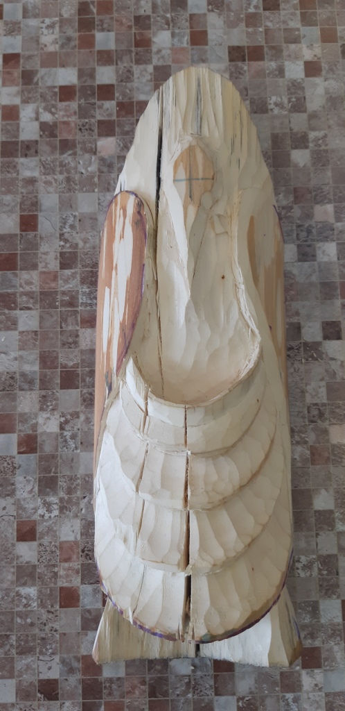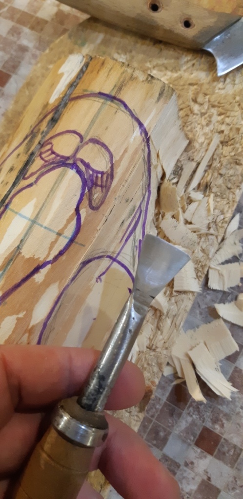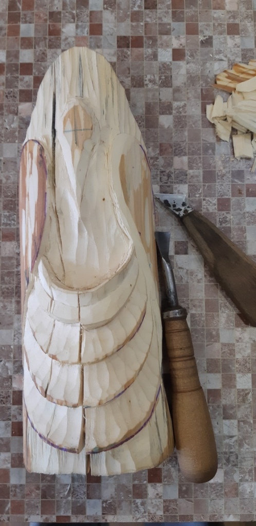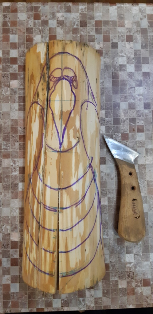 Для работы нужны: липовый сучок, пара острых ножей (специально использовал минимум: две полукруглые стамески - большую и маленькую - и два «косяка» - большой и маленький), карандаш, наждачная бумага, морилка водная, лак аэрозольный, а также старая разделочная доска или кусок фанерки - это почти самый главный инструмент «кухонного» резчика. В моём случае ещё понадобилась арматура от старого, пришедшего в негодность светильника. Но и в качестве просто настенного панно ворона смотрится неплохо.