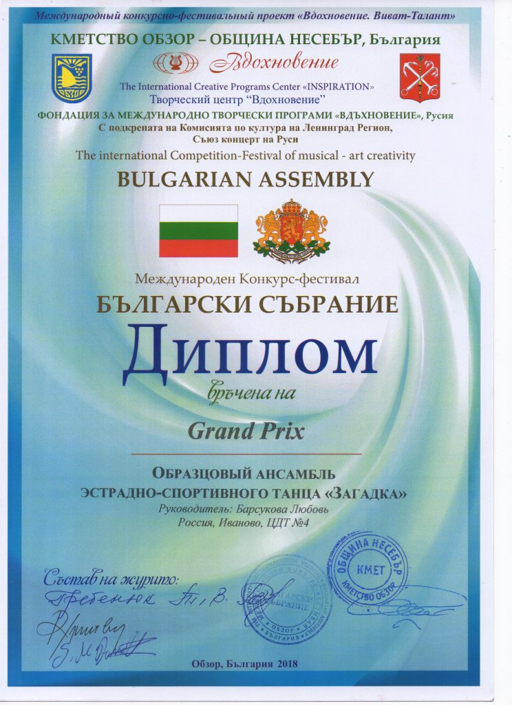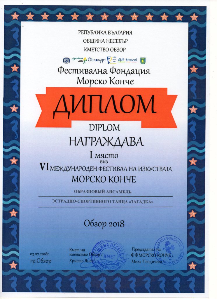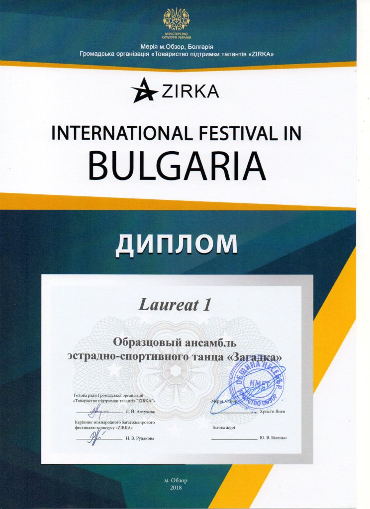 Коллектив был удостоен Гран-при XIV Международного конкурса-фестиваля искусств «Болгарские Ассамблеи – 2018», завоевал I место на VI Международном фестивале искусства «Морско конче» и стал Лауреатом I степени на «ZIRKA» INTERNATIONAL FESTIVAL IN BULGARIA.
