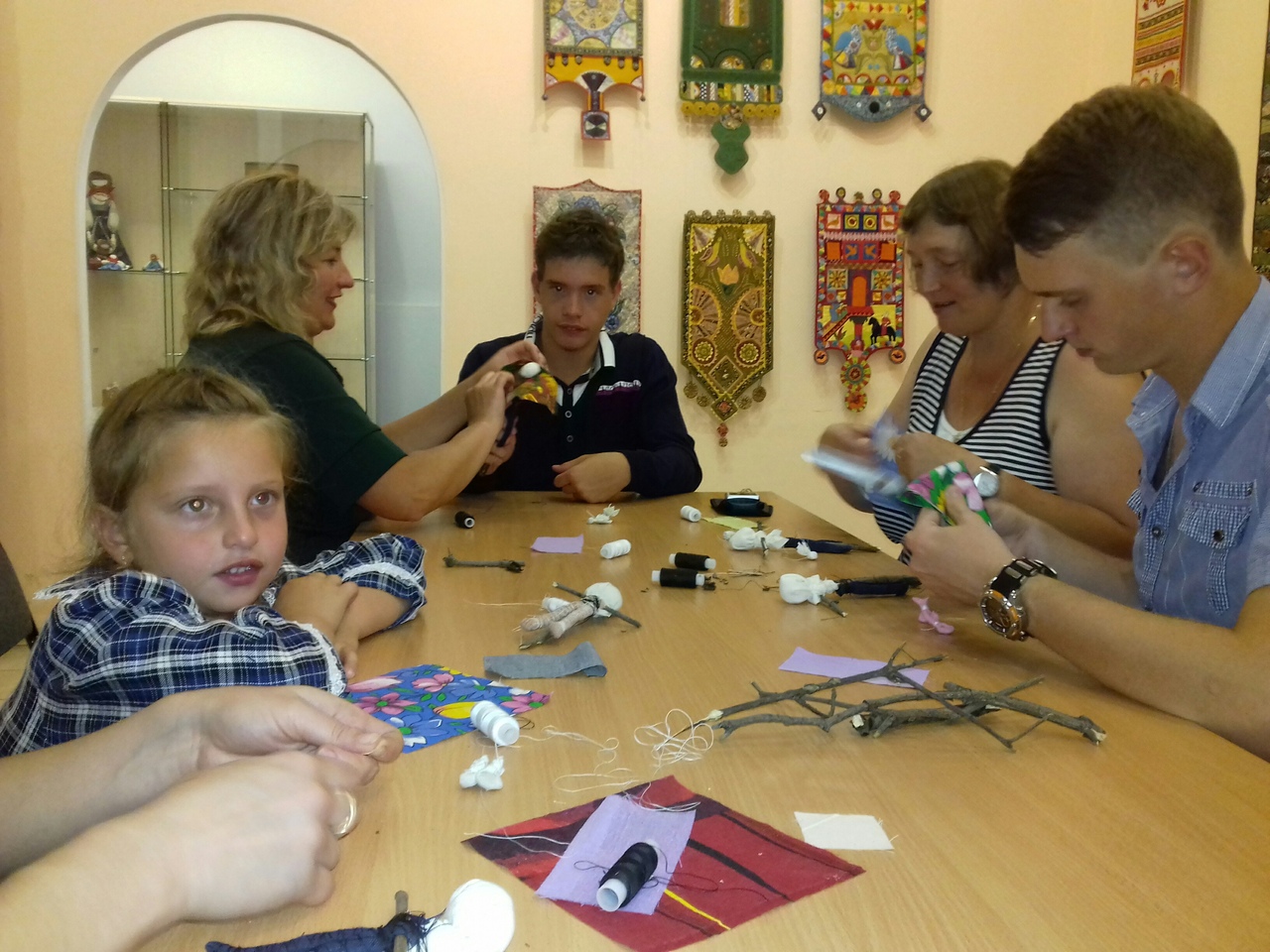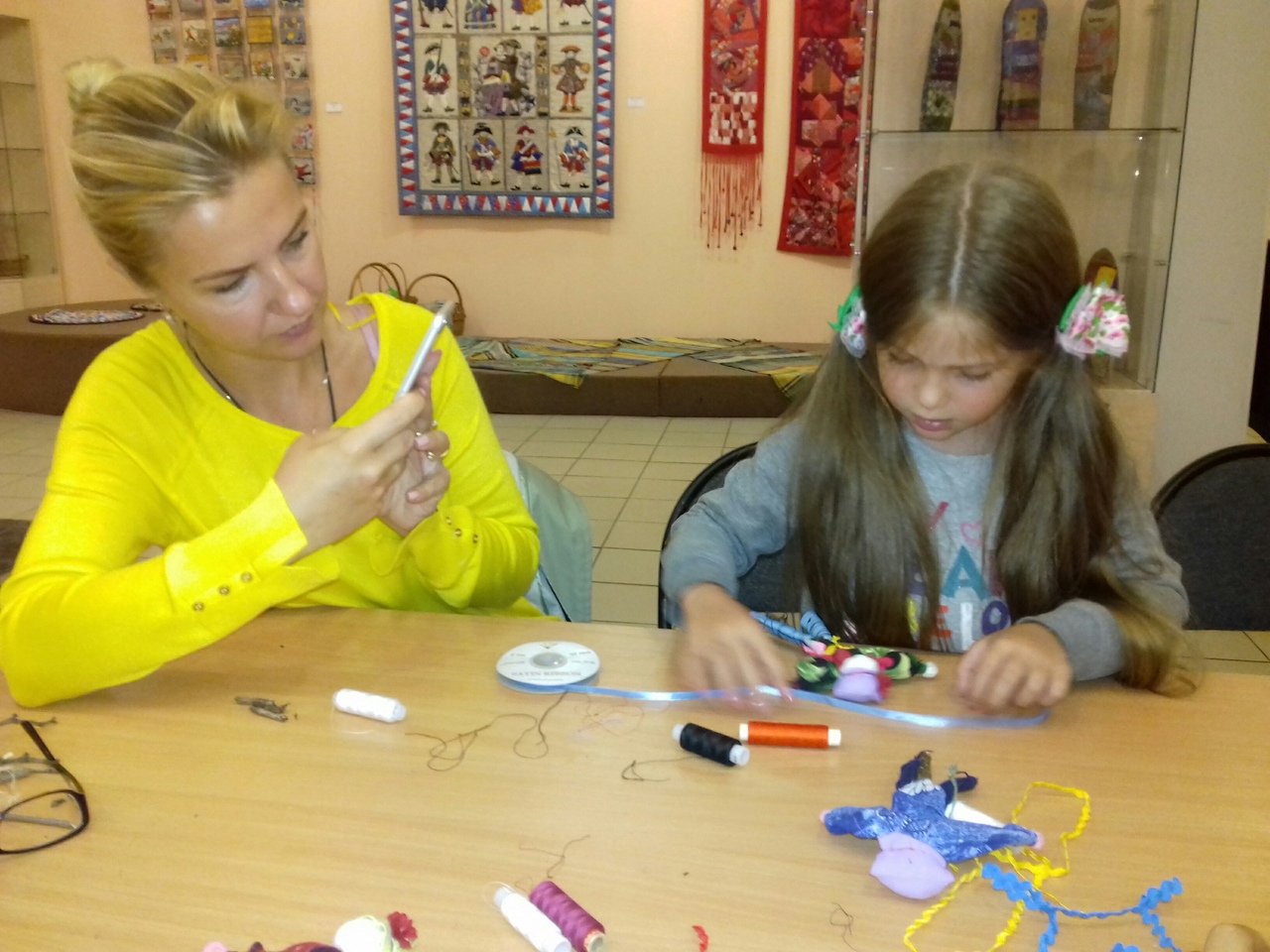 Ведущий методист по декоративно-прикладному искусству Анастасия Шоличева провела для гостей экскурсию по выставке и мастер-класс по созданию традиционной тряпичной куклы Кулачника. Посетители с интересом рассматривали репродукции известных лубочных картинок "Кот казанский", "Удалые молодцы, добрые борцы", "Медведь с козой прохлаждается". Затем все вместе отгадывали загадки, вышитые на панно "По горам, по долам", смеялись над работой "Частушки", узнавали любимых героев русских сказок на панно "Сказки", внимательно разглядывали обмундирование и форму солдат с панно "Лейб-гвардия".