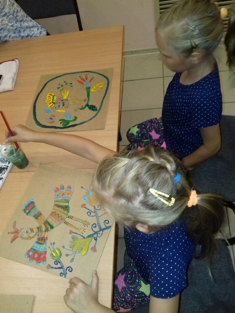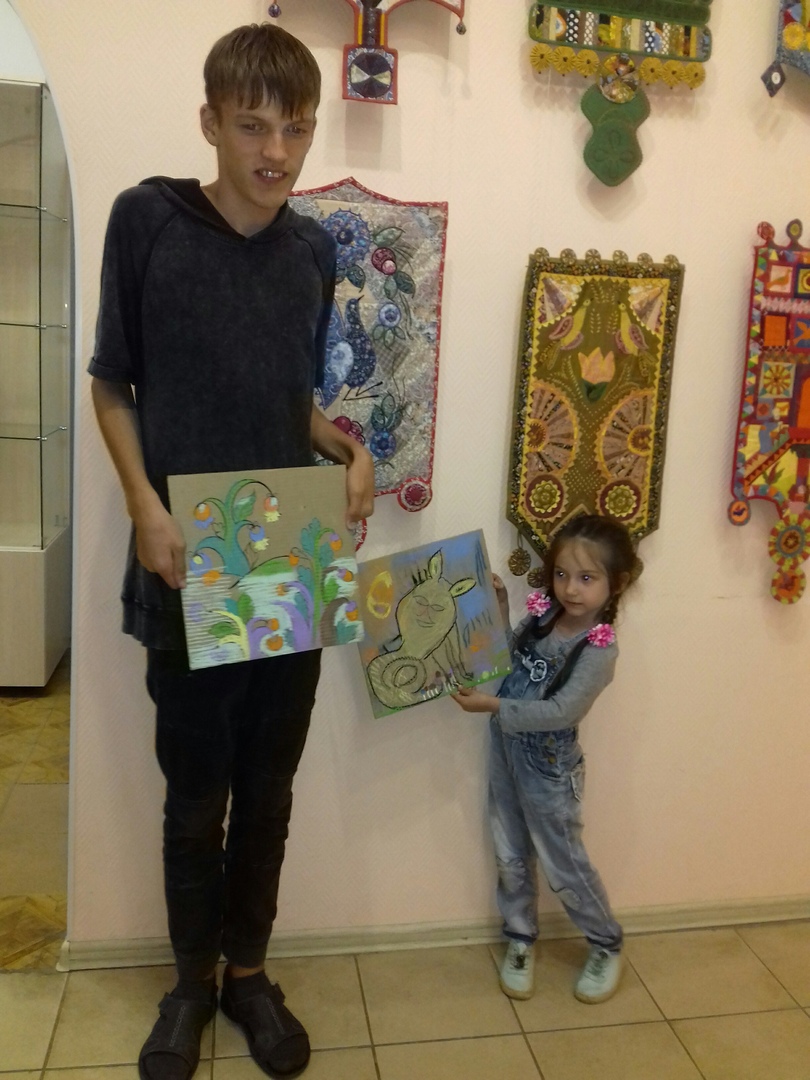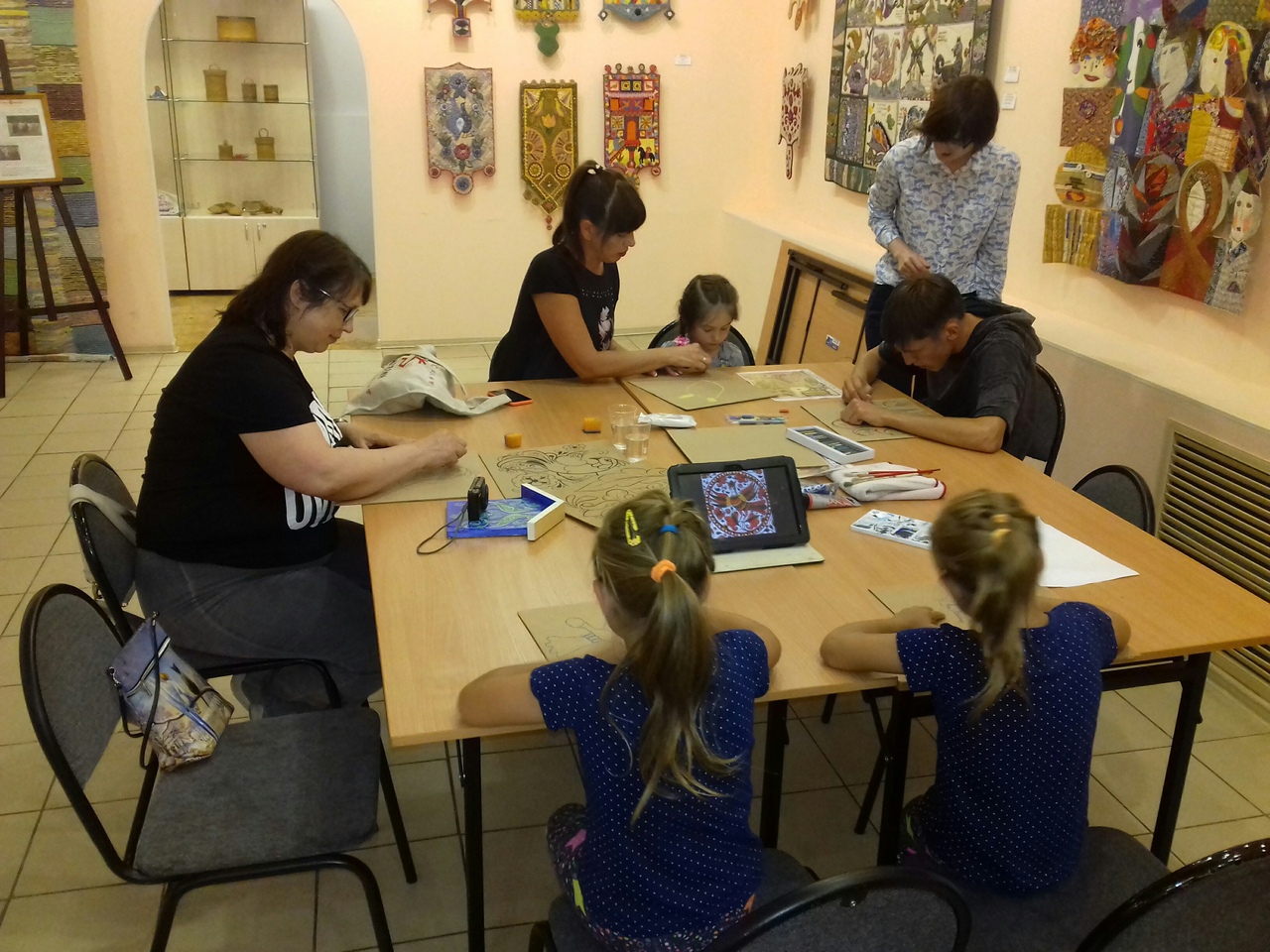 Пришедшие на мероприятие родители с детьми и просто интересующиеся народной культурой посетители посмотрели выставку, узнали о понятии "лубок" и об истории появления на Руси лубочных картинок, нашли сходства изображённых на панно сюжетов и традиционных картинок с русских лубков. А затем под руководством художницы попробовали сами нарисовать лубочную иллюстрацию на картоне пастельными мелками и акриловыми красками. На мастер-классе снова присутствовала мама с особым ребёнком из сообщества "Мы есть!". Сеня на удивление легко справился со своей творческой работой, почти без подсказок мамы и преподавателя, интуитивно выбирая цвета для картинки.