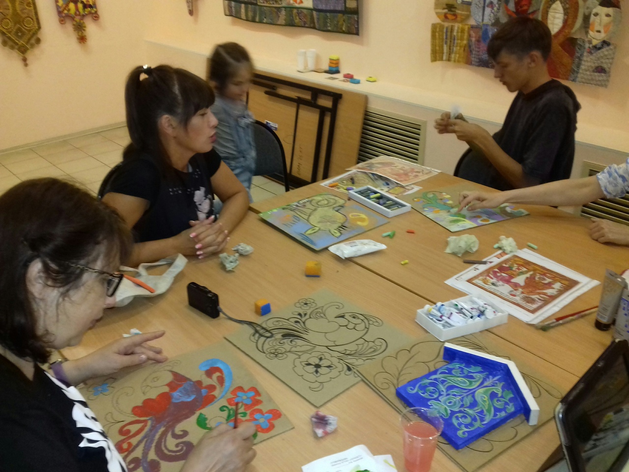25 июля на выставке клуба-мастерской лоскутного шитья "Красный сарафан" из фольклорного центра "Кунцево" (г. Москва) состоялся мастер-класс по рисованию лубочных картинок от ивановской художницы Полины Барановой.