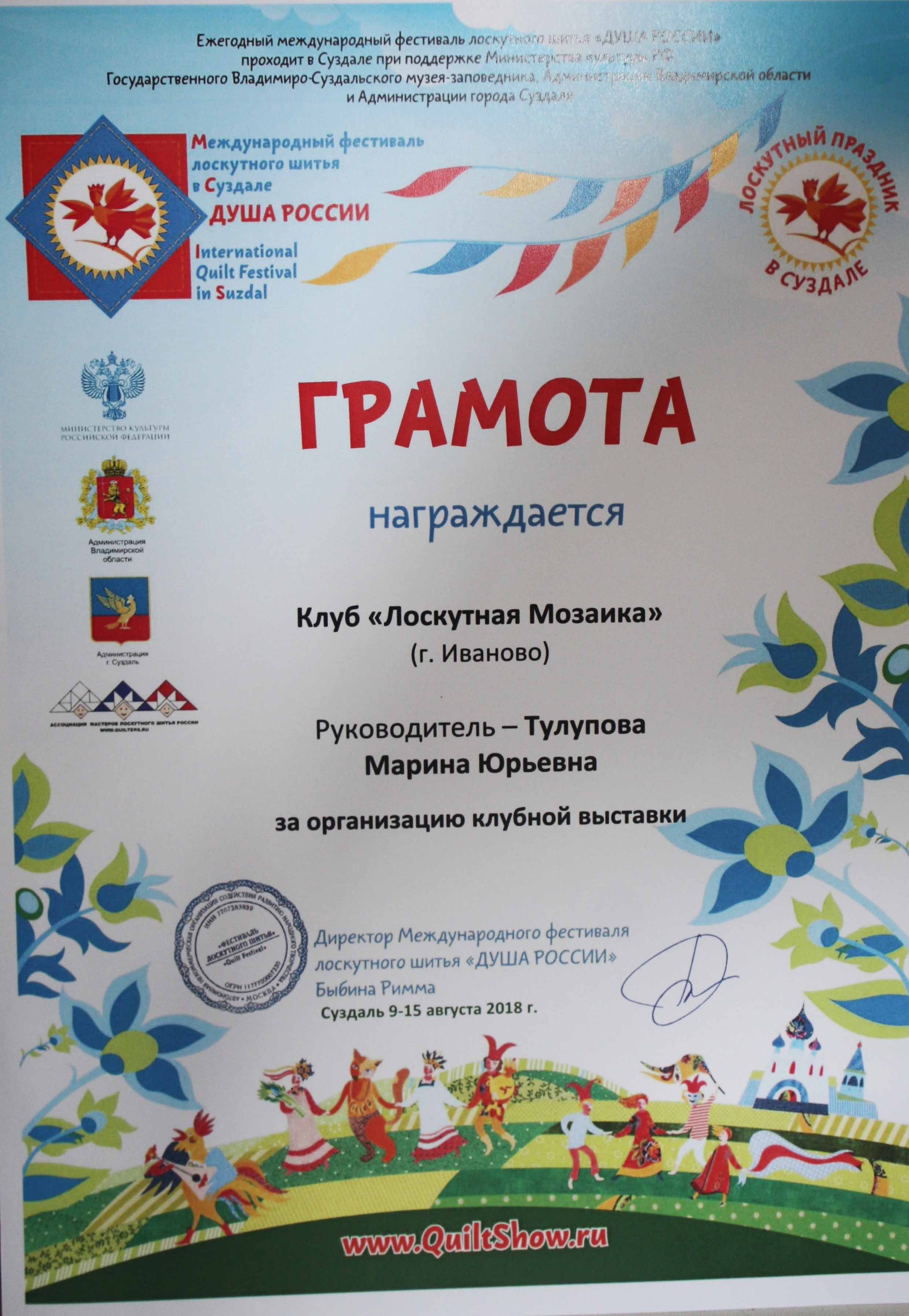 С 9 по 16 августа 2018 в городе Суздаль Владимирской области проходил очередной Международный фестиваль лоскутного шитья "Душа России", среди множества участников были и лоскутницы из ивановского клуба. На конкурс с темой "Праздник" было заявлено три коллективных работы. Одна из них получила Гран-При. Это панно "Крещение. Солнце играет..." творческой группы Шохиной Светланы Николаевны.