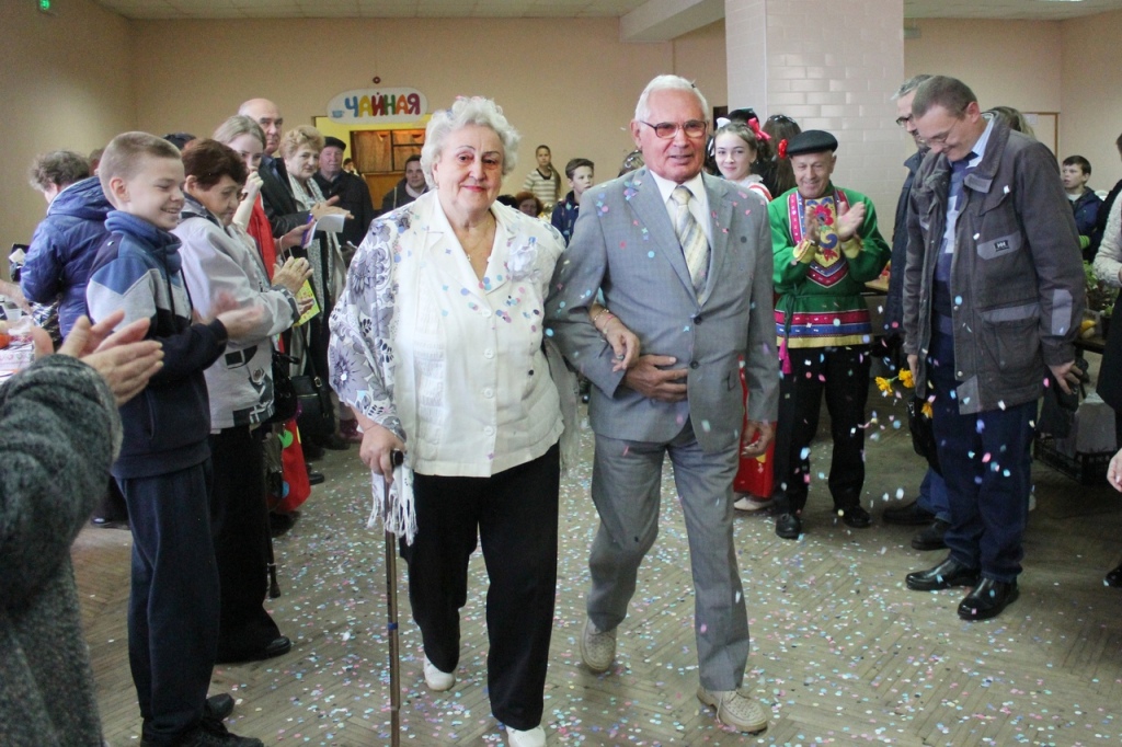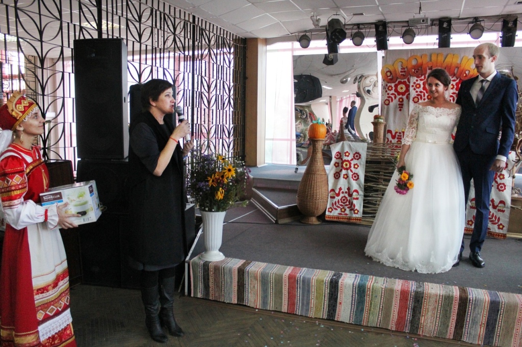 На ярмарке гостей развлекали весёлые скоморохи и скоморошины, ведущая проводила ярмарочные игрища, а чуть позже на гуляние заглянул и сам Петрушка, который хотел найти на празднике себе невесту. А всё потому, что раньше на Руси на осенины всегда выпадала пора свадеб. И тут ярмарка тоже удивила гостей – здесь можно было встретить самых настоящих молодожёнов. Михаил и Анастасия Румянцевы прямо в свадебных нарядах посетили праздник и поделились своей радостью от создания семьи со всеми гостями. Директор ОКМЦКТ, Кривцова Ольга Борисовна, от лица центра поздравила молодожёнов и пожелала им долгой и счастливой семейной жизни. Но и на этом сюрпризы не закончились, ведь после молодой семейной пары на ярмарке чествовали и изумрудную пару (56 лет в браке). Ольга Борисовна поздравила семью с таким большим опытом семейной жизни и попросила поделиться с молодой парой секретом «семейного долголетия». Секрет оказался простым: любовь, уважение и честность перед супругом.