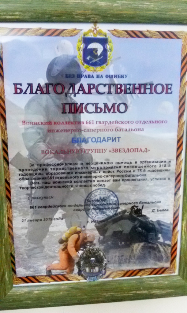Поздравить воинский коллектив 661 гвардейского батальона приехало много гостей. В их числе - коллектив областного центра культуры и творчества вокальная группа «Звездопад». Прозвучали песни о Родине, о России, о любви. Хорошее настроение, огромный заряд энергии и массу положительных эмоций получили все участники мероприятия.