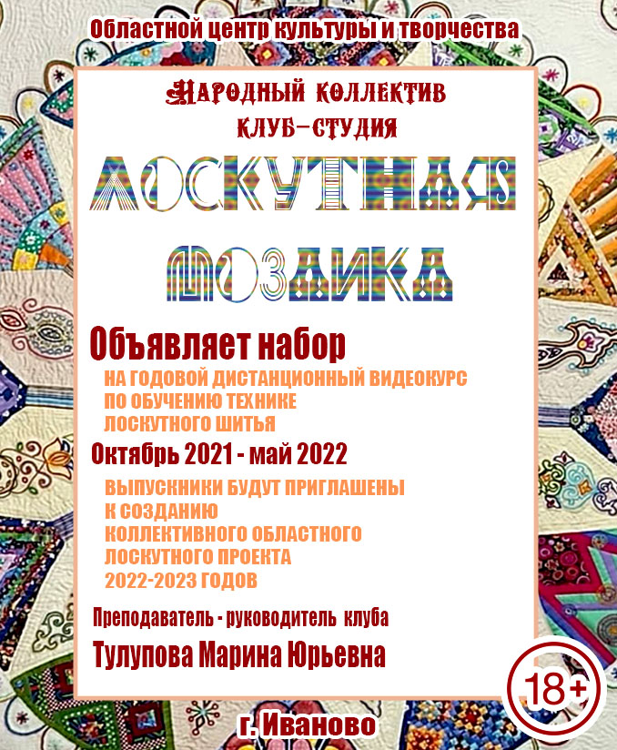 Автономное государственное учреждение Ивановской области «Областной координационно-методический центр культуры и творчества» объявляет о старте годового дистанционного видеокурса по лоскутному шитью.