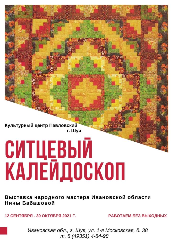 12 сентября в культурном центре Павловский (г. Шуя) открылась персональная выставка народного мастера Ивановской области Нины Бабашовой «Ситцевый калейдоскоп». Нина Евгеньевна является членом Ивановского областного отделения Союза художников России. На выставке представлены лоскутные панно и одеяла, а также авторская коллекция напёрстков из разных стран и городов.