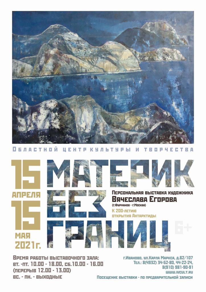 15 апреля 2021 года в 16.00 в выставочном зале областного координационно-методического центра культуры и творчества открывается персональная выставка художника-живописца Вячеслава Егорова «Материк без границ», посвящённая 200-летию открытия Антарктиды.
