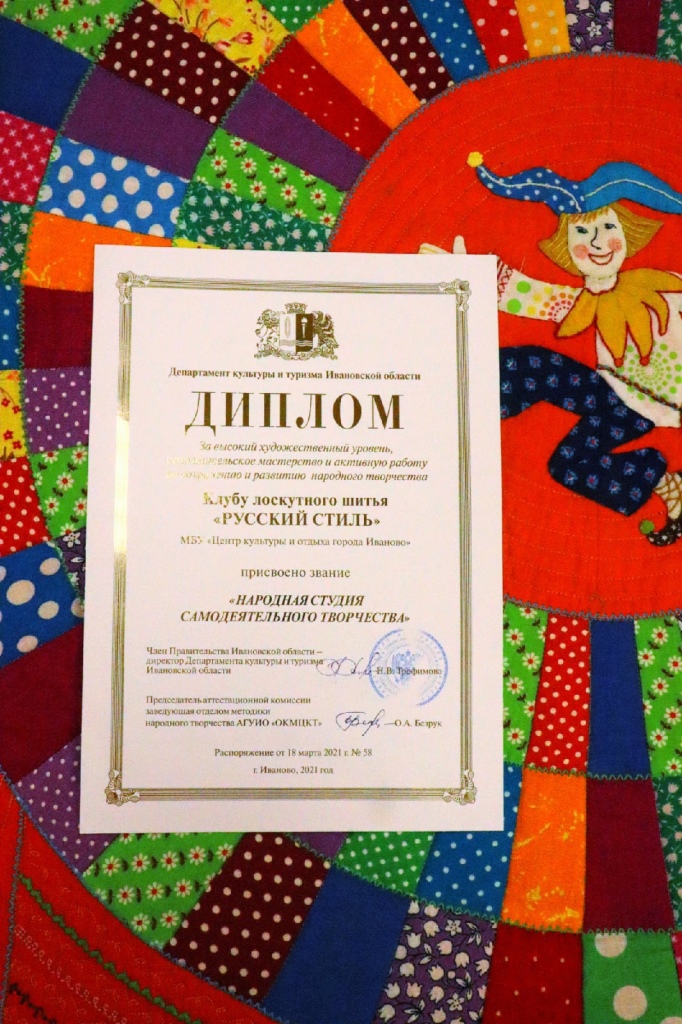 Распоряжением Департамента культуры и туризма №58 от 18 марта 2021 года клубу лоскутного шитья «Русский стиль» при МБУ «Центр культуры и отдыха города Иваново» присвоено звание «Народная студия самодеятельного творчества».