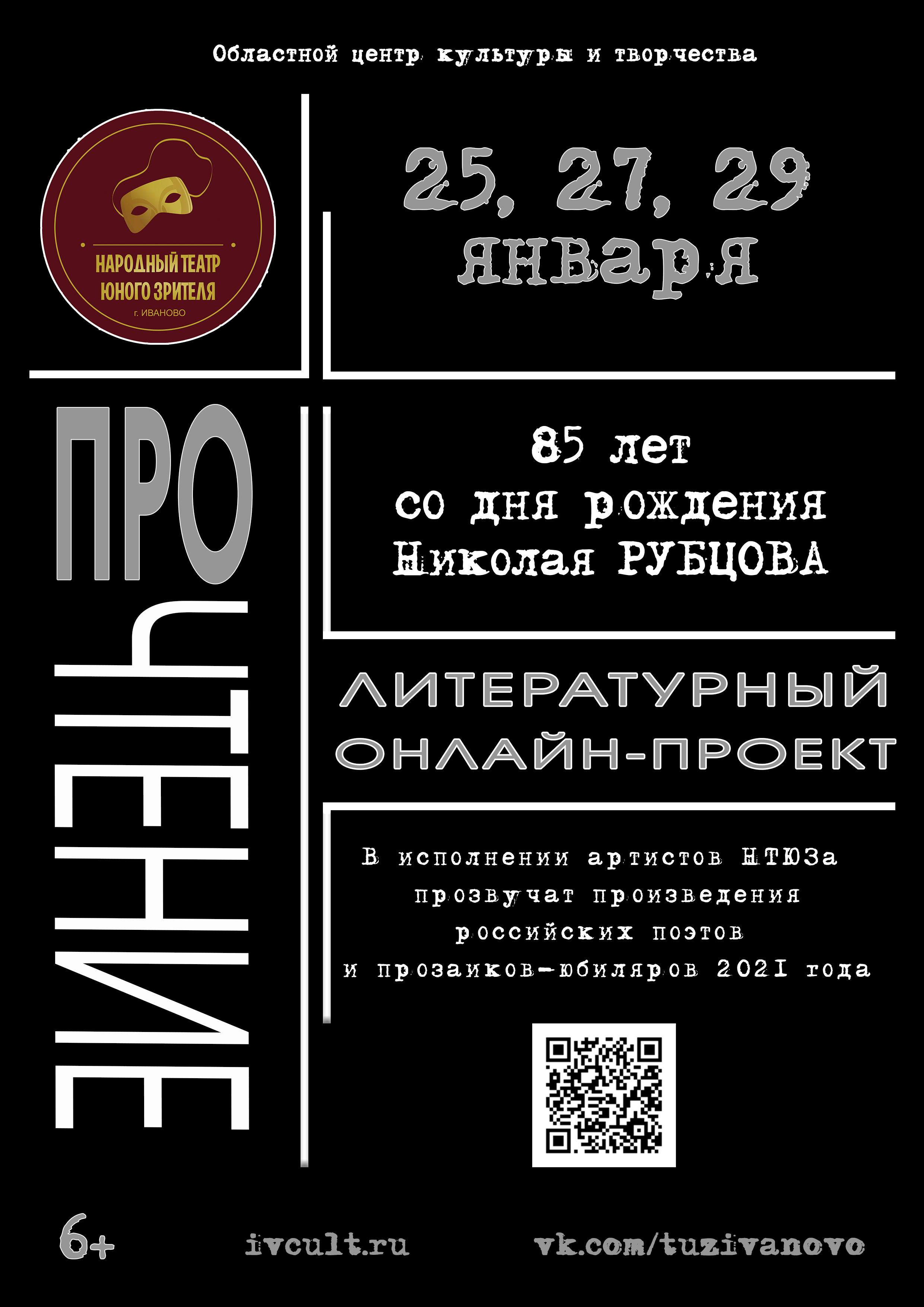Заслуженный коллектив народного творчества Ивановской области народный театр юного зрителя представляет новый проект, направленный на популяризацию произведений отечественных поэтов и прозаиков. Название проекта – ПРОчтение, это часть нового цикла «ПРО», который представляет собой «Простой Разговор О…». В рамках данного цикла артисты НТЮЗа поведут свой разговор о знаковых спектаклях театра за все годы его существования, поделятся секретами создания бутафории для любительских театров, проведут мастер-классы, покажут влоги о своих поездках и выступлениях.