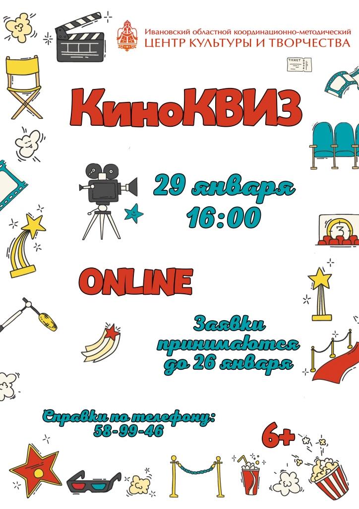 29 января в 16.00 АГУИО «Областной координационно-методический центр культуры и творчества» проведет для жителей Ивановской области командную интеллектуальную игру «КиноКВИЗ» на знание советского и современного кинематографа.