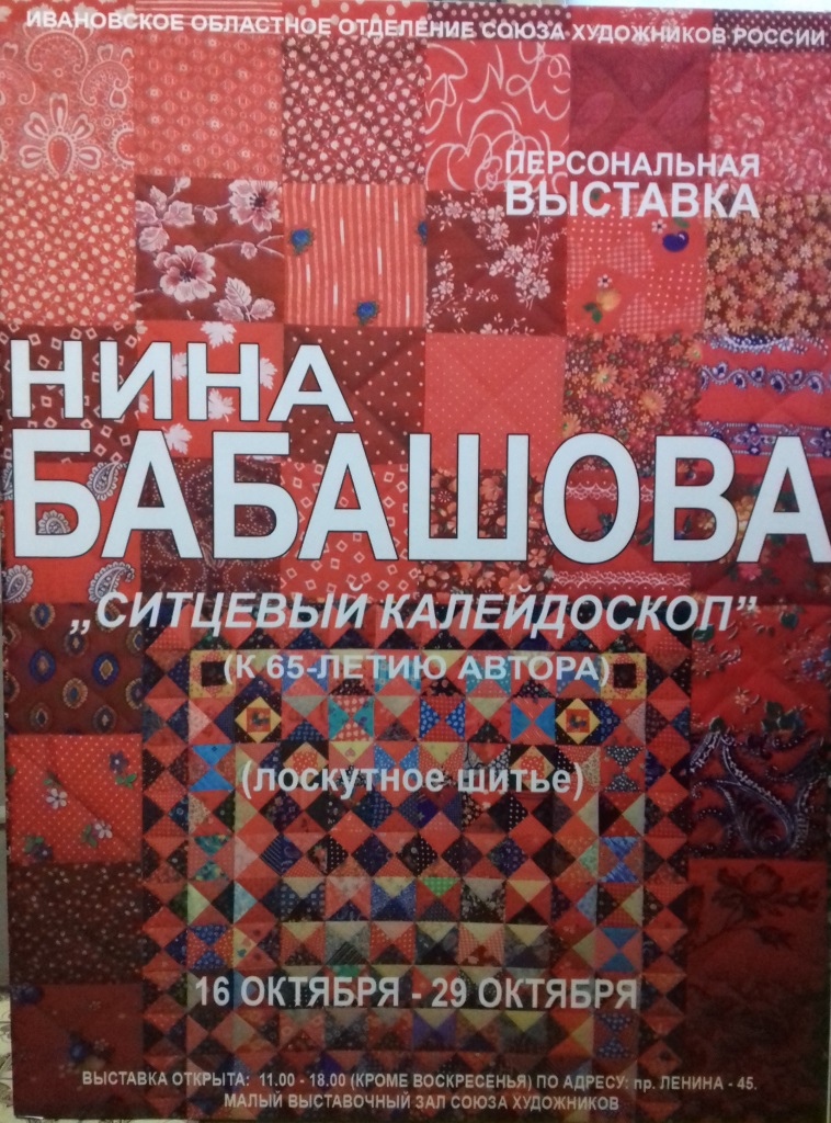 15 октября в Ивановском отделении Союза художников России открылась персональная выставка народного мастера Ивановской области Нины Бабашовой «Ситцевый калейдоскоп», выставка посвященная 65-летию мастерицы и 25-летию выставочной деятельности. На ней представлены известные и новые, сшитые в этом году, лоскутные панно, посвящённые отдельным текстильным предприятиям Ивановского региона, а также художникам по ткани В. Колесову, Л. Зиминой, М. Тощевой.