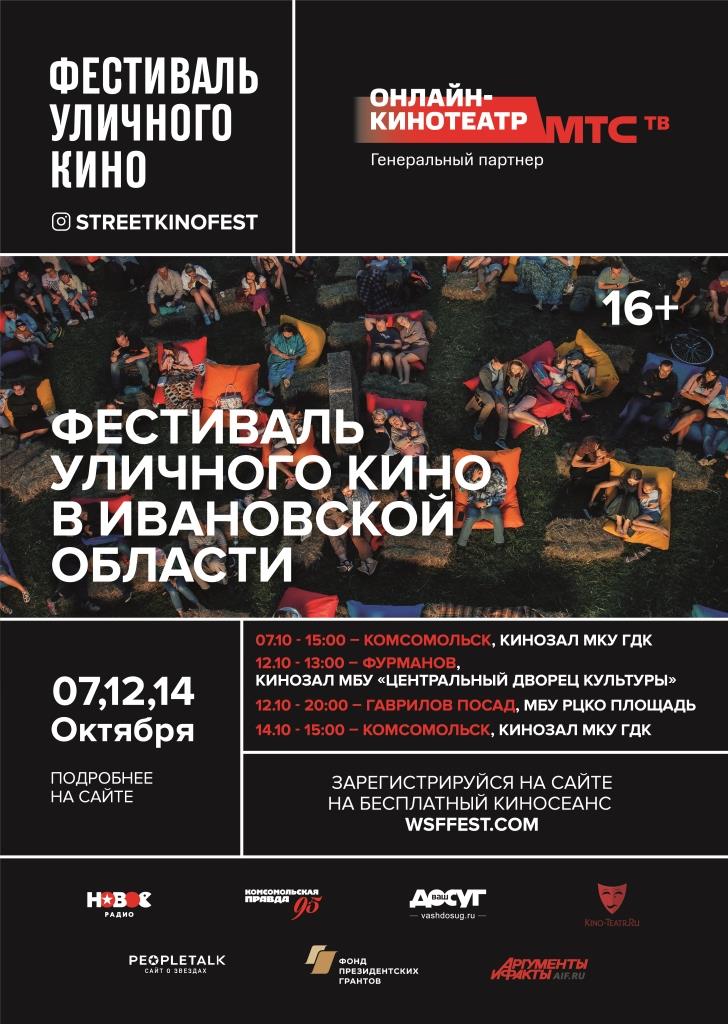 7, 12, 14 октября 2020 года на киноплощадках Ивановской области – г. Фурманов (Центральный Дворец культуры), г. Комсомольск (городской Дом культуры), г. Гаврилов Посад (районное централизованное клубное объединение) – прошли кинопоказы фильмов-участников конкурсной программы седьмого фестиваля уличного кино.