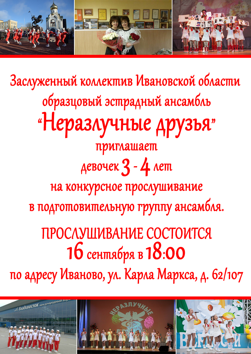 16 сентября 2019 года в 18:00 в областном центре культуры и творчества состоится конкурсное прослушивание в подготовительную группу образцового эстрадного ансамбля "Неразлучные друзья" (руководители Заслуженные работники культуры РФ Марина Альбертовна и Наталья Альбертовна Соковы).