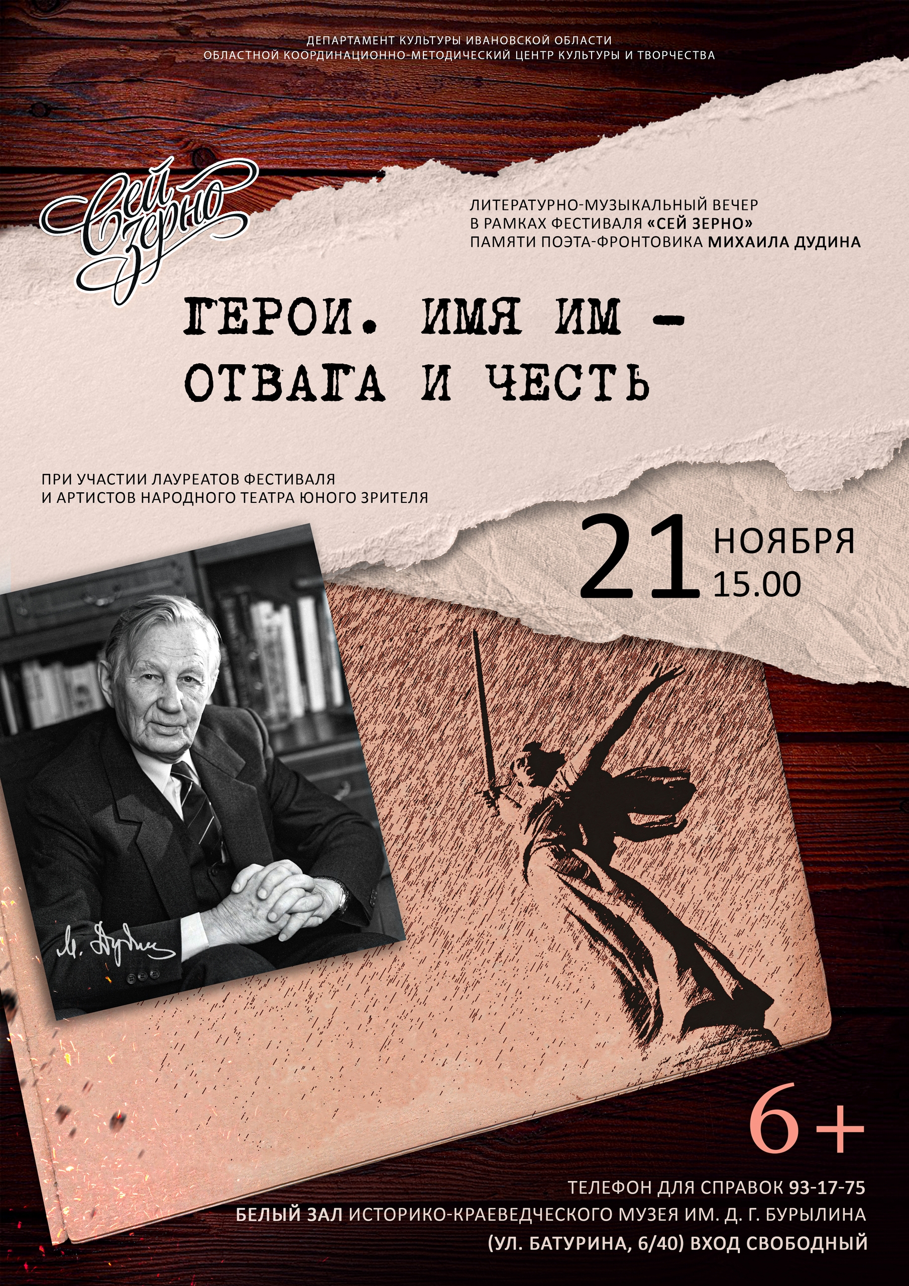 21 ноября в 15.00 в Белом зале Ивановского государственного историко-краеведческого музея имени Дмитрия Бурылина пройдет литературно-музыкальный вечер, посвященный Михаилу Александровичу Дудину.