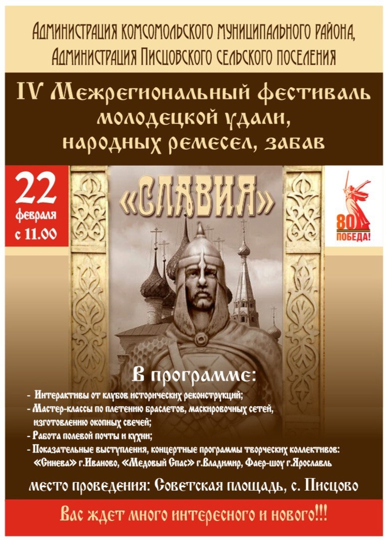 22 февраля 2025 года в 11.00 в старинном селе Писцово Комсомольского муниципального района Ивановской области состоится ежегодный Межрегиональный военно-патриотический фестиваль «СЛАВИЯ».