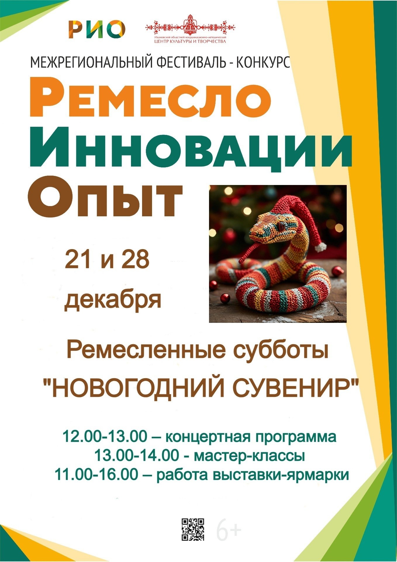 21 и 28 декабря 2024 г. в Текстильном центре «РИО» в рамках Межрегионального фестиваля-конкурса «Ремесло. Инновации. Опыт» пройдут завершающие ремесленные субботы этого года. Тема - «Новогодний сувенир».