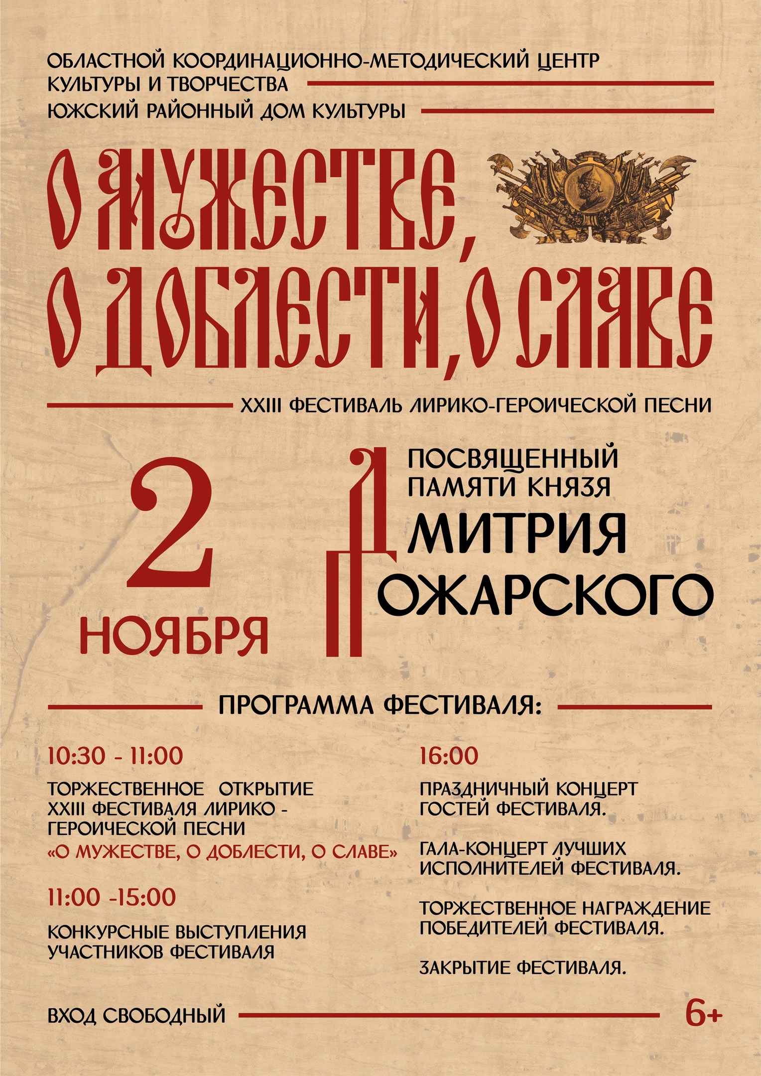 2 ноября 2024 года в Доме культуры г. Южа состоится XXIII межрегиональный фестиваль-конкурс лирико-героической песни «О мужестве, о доблести, о славе», посвященный памяти князя Д. М. Пожарского.