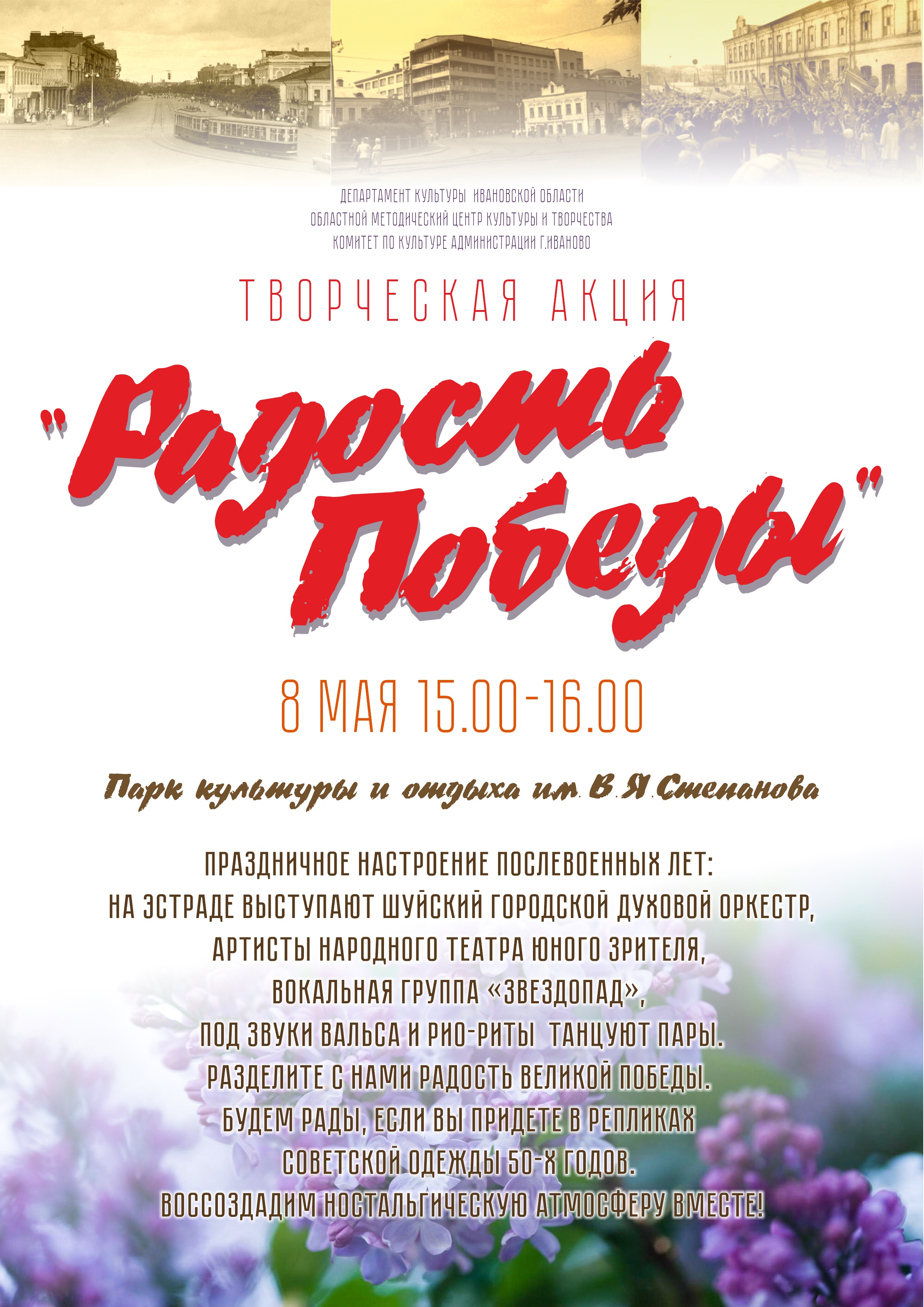 8 мая 2024 года с 15.00 до 16.00 на открытой сцене Парка культуры и отдыха имени В.Я.Степанова г.Иваново пройдет творческая акция «Радость Победы». Этот проект посвященный празднованию Дня Победы Областной методический центр культуры и творчества впервые провел в 2022 году. Символическая реконструкция паркового предпраздничного мероприятия советского времени, на этот раз гости окажутся в 1951 году. На площади реют красные флаги, на эстраде звучат песни и стихи в исполнении самодеятельных артистов, а гости парка танцуют вальс и Рио-Риту.