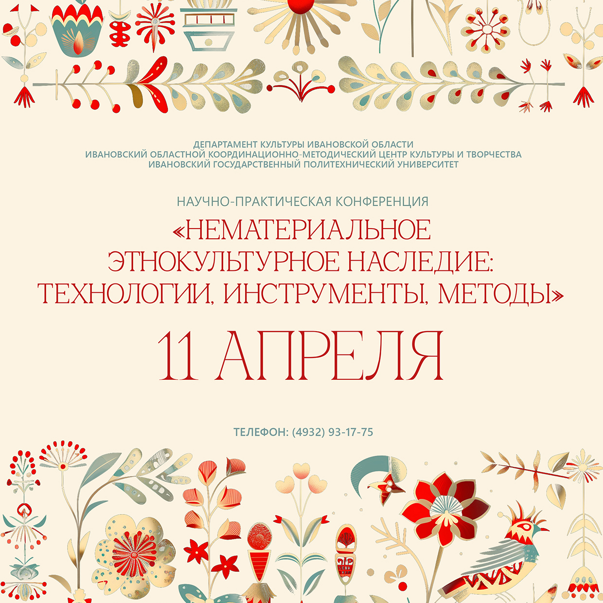 11 апреля в Ивановском политехническом университете (Шереметьевский проспект, 21) состоится научно-практическая конференция «Нематериальное этнокультурное достояние: технологии, инструменты, методы», организованная Областным координационно-методическим центром культуры и творчества совместно с Ивановским политехническим университетом.