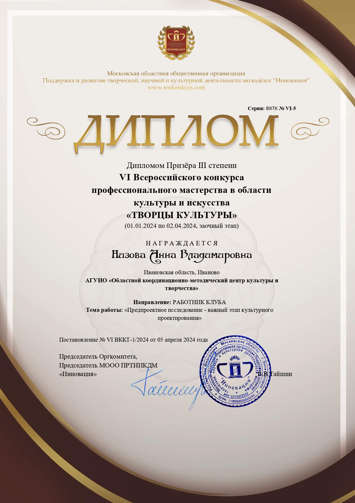 Подведены итоги VI Всероссийского конкурса профессионального мастерства в области культуры и искусства «Творцы культуры», организатором которого выступает Московская областная общественная организация «Поддержка и развитие творческой, научной и культурной деятельности молодежи «Инновация».