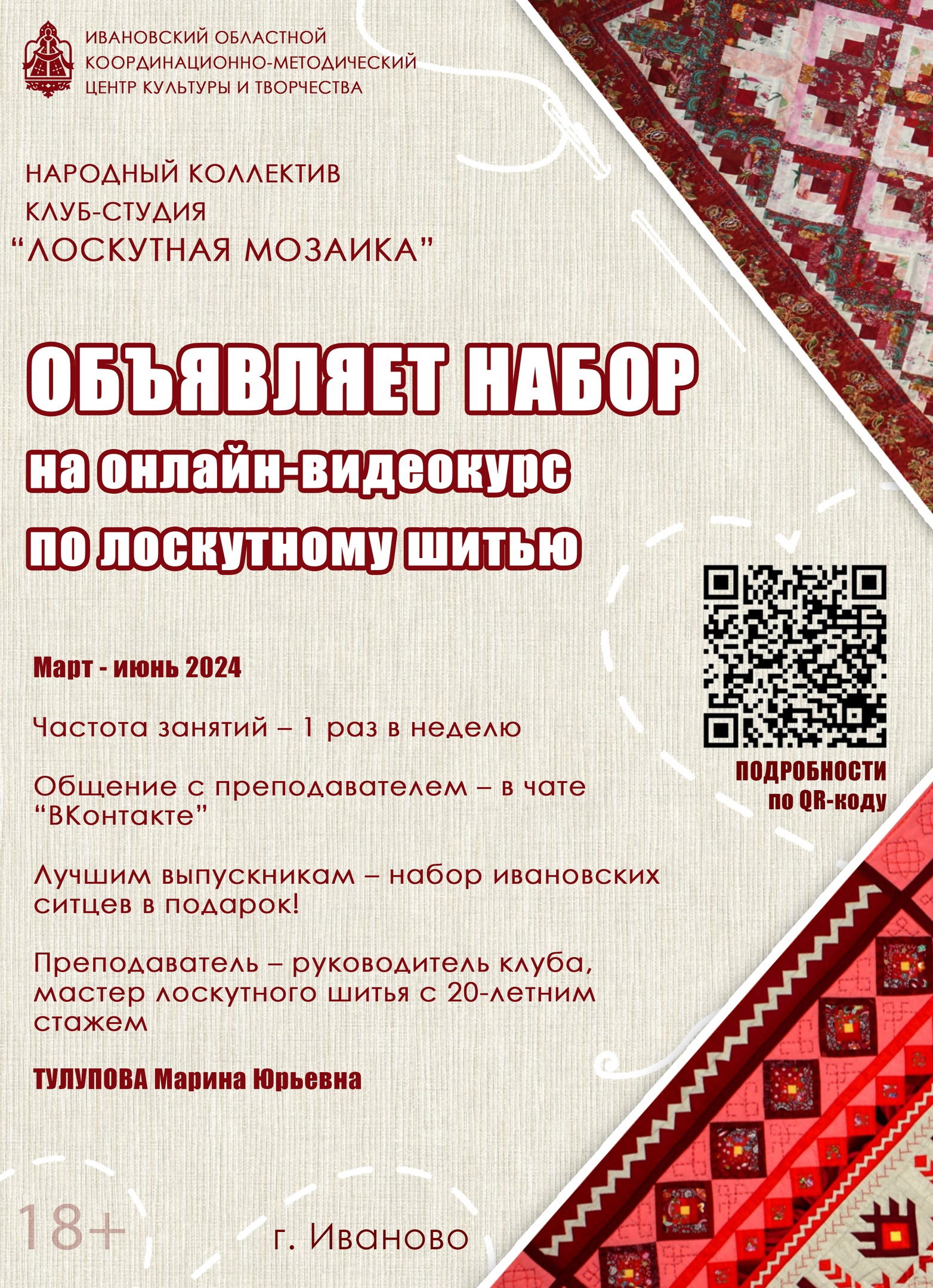 Преподаватель - Марина Тулупова, руководитель народного коллектива клуба-студии «Лоскутная мозаика», мастер лоскутного шитья с 20-летним стажем .