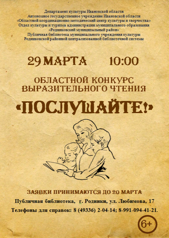 Традиционный областной конкурс выразительного чтения «Послушайте!» пройдет в г.Родники в рамках недели детской книги 29 марта. Прием заявок будет осуществляться до 20 марта. справки по телефонам: 8(49336) 2-26-35, 2-04-14