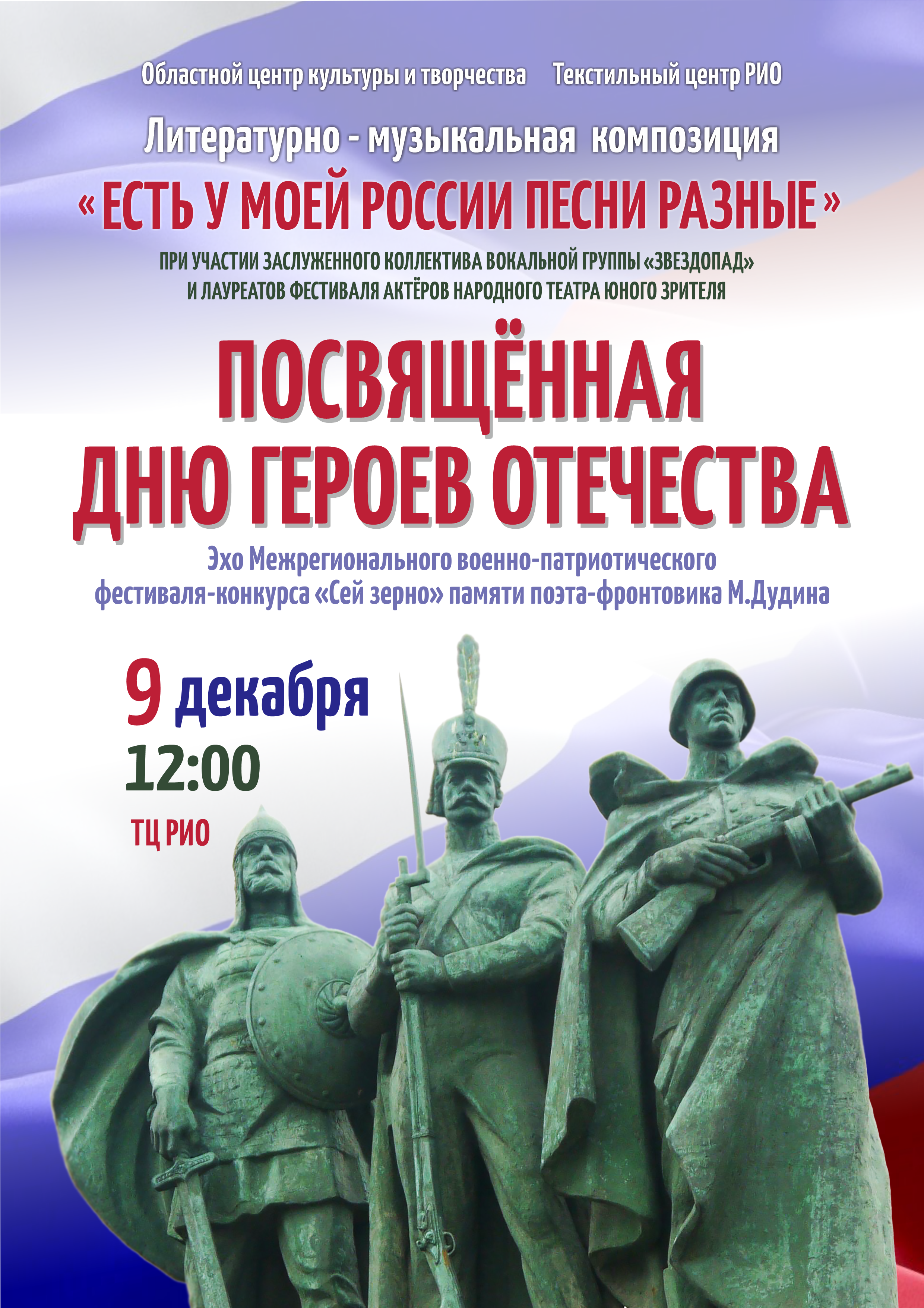 В честь этого знаменательного события, 9 декабря в 12 часов в текстильном центре «РИО» состоится литературно-музыкальная композиция заслуженного коллектива народного творчества Ивановской области вокальной группы «Звездопад» под руководством почетного работника культуры Ивановской области – Алексея Булгакова и заслуженного коллектива народного творчества Ивановской области народного театра юного зрителя - лауреатов межрегионального военно-патриотического фестиваля-конкурса «Сей зерно».