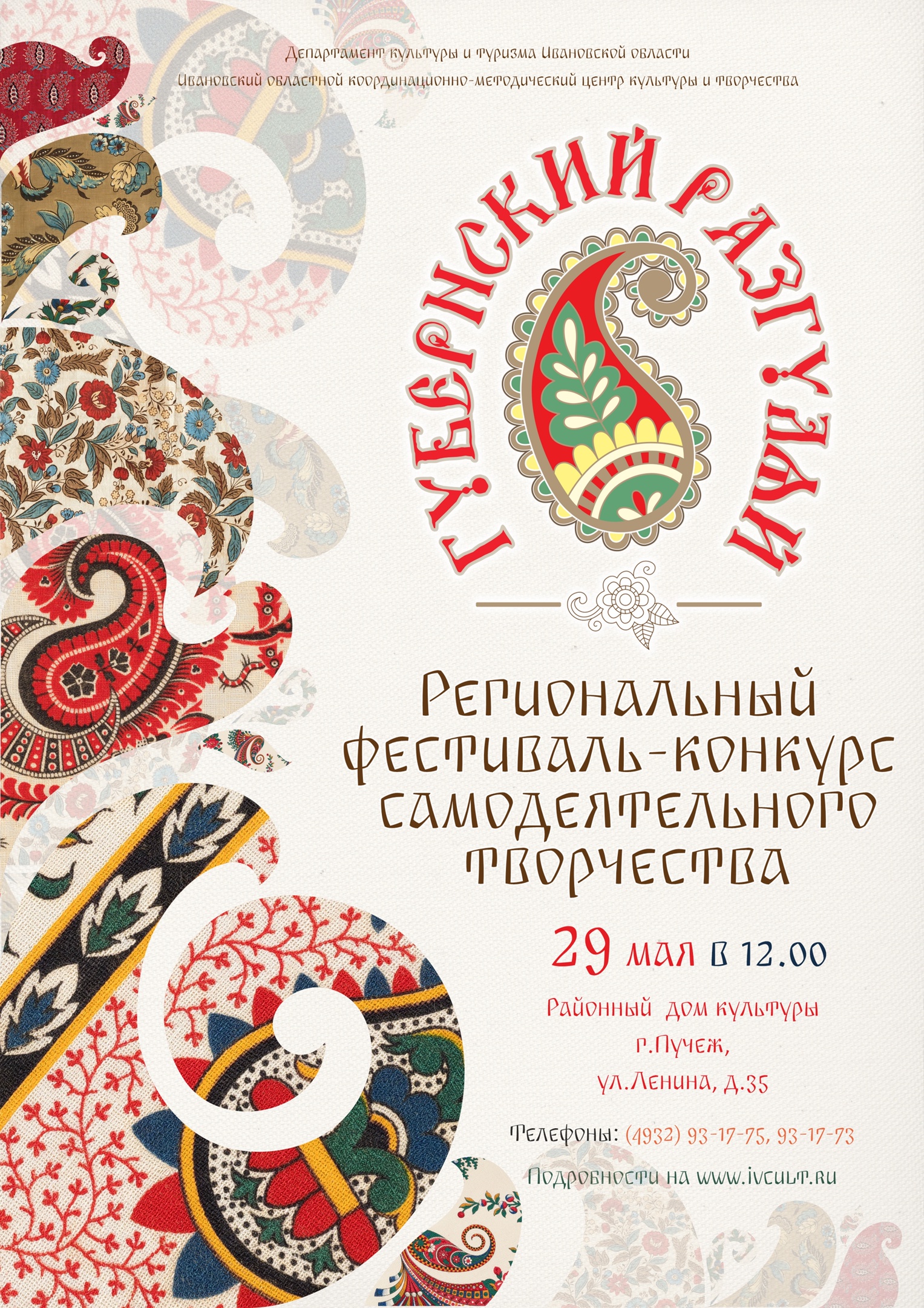 29 мая в Районном Доме культуры города Пучеж состоится зональный этап фестиваля-конкурса самодеятельного народного творчества «Губернский разгуляй». Стартовал он 17 апреля во Дворце культуры им. В.И. Ленина г. Тейково, 15 мая прошел в городе Кинешма.