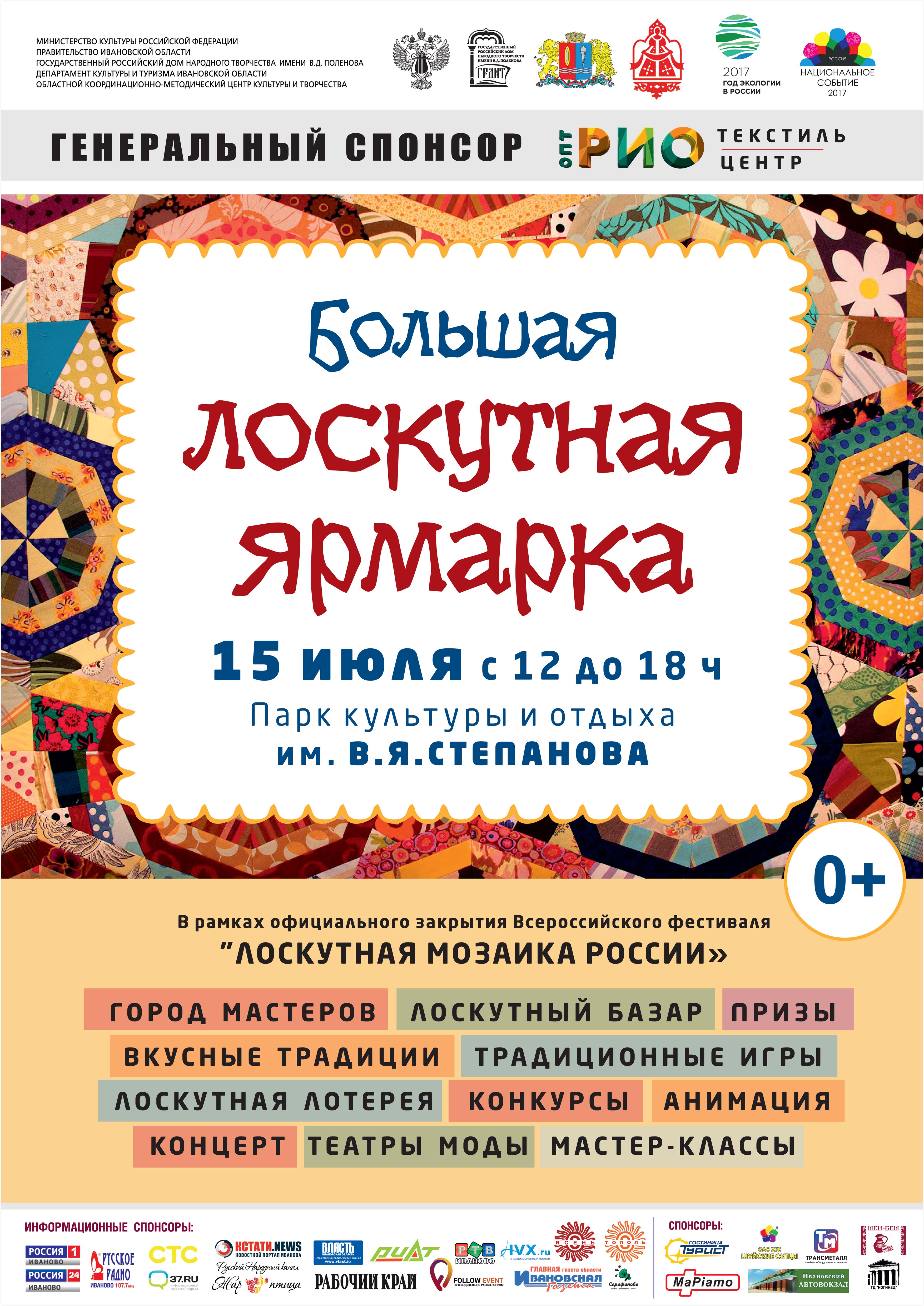 15 июля на территории парка культуры и отдыха им. В.Я. Степанова в рамках заключительных мероприятий XI Всероссийского фестиваля декоративного искусства «Лоскутная мозаика России» состоится грандиозное событие – Большая лоскутная ярмарка.