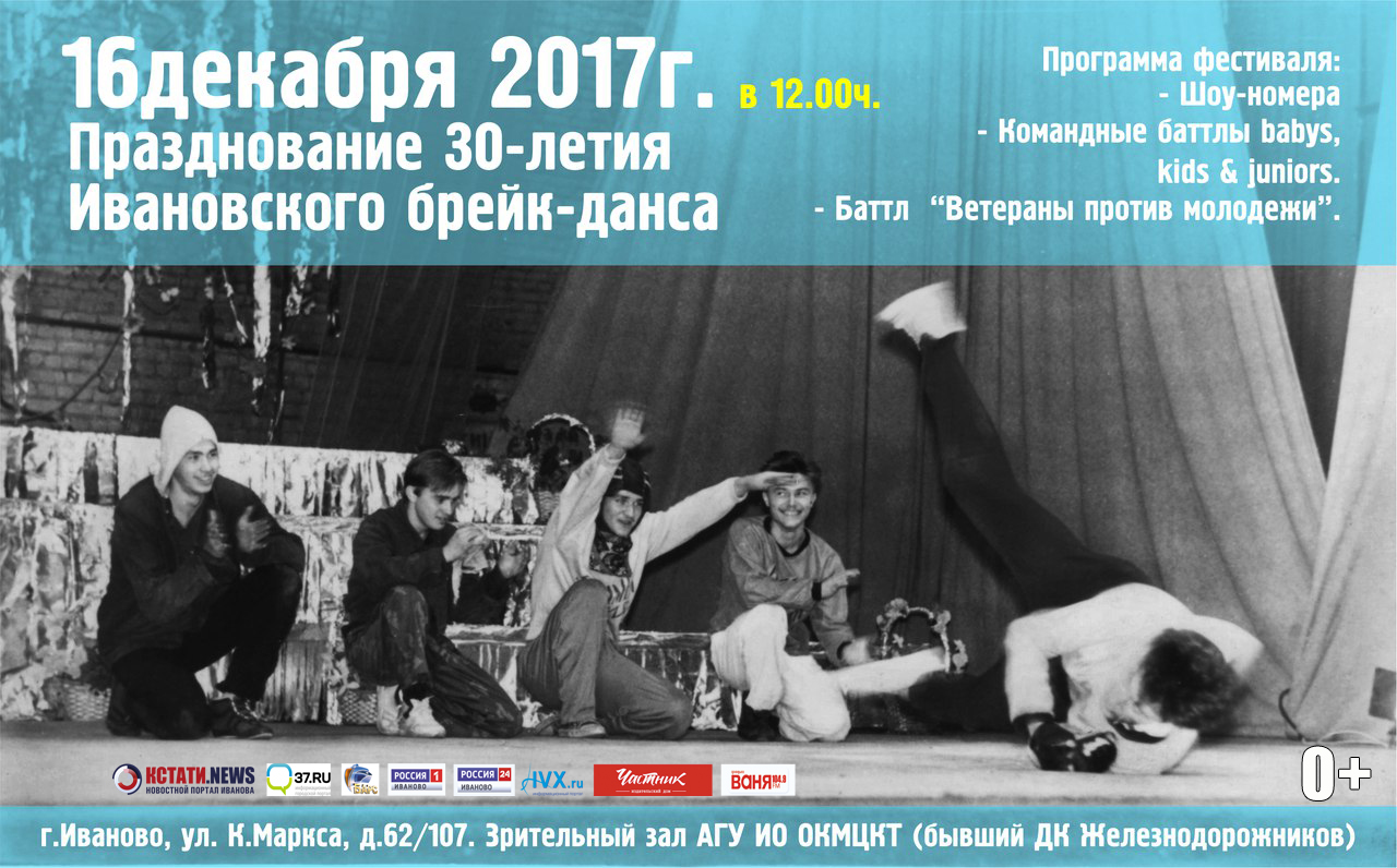 Программа празднования 30-летия ивановского брейк-данса будет состоять из показательных номеров различных коллективов брейк-данса г. Иванова, Ивановской области и представителей разных поколений брейкеров. Также пройдут соревнования (баттлы) среди команд младшего и среднего возраста, в том числе «исторический» баттл «Молодёжь против ветеранов».