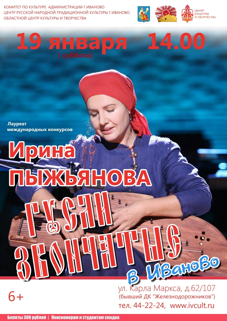 ИРИНА ПЫЖЬЯНОВА - лауреат международных конкурсов, талантливая исполнительница на гуслях, леверсной арфе и колёсной лире. Всю красоту игры на этих необычных музыкальных инструментах можно оценить на концерте 19 января в 14.00 в Центре культуры и творчества (бывший ДК «Железнодорожников») по адресу: г. Иваново, ул. Карла Маркса, д. 62/107.