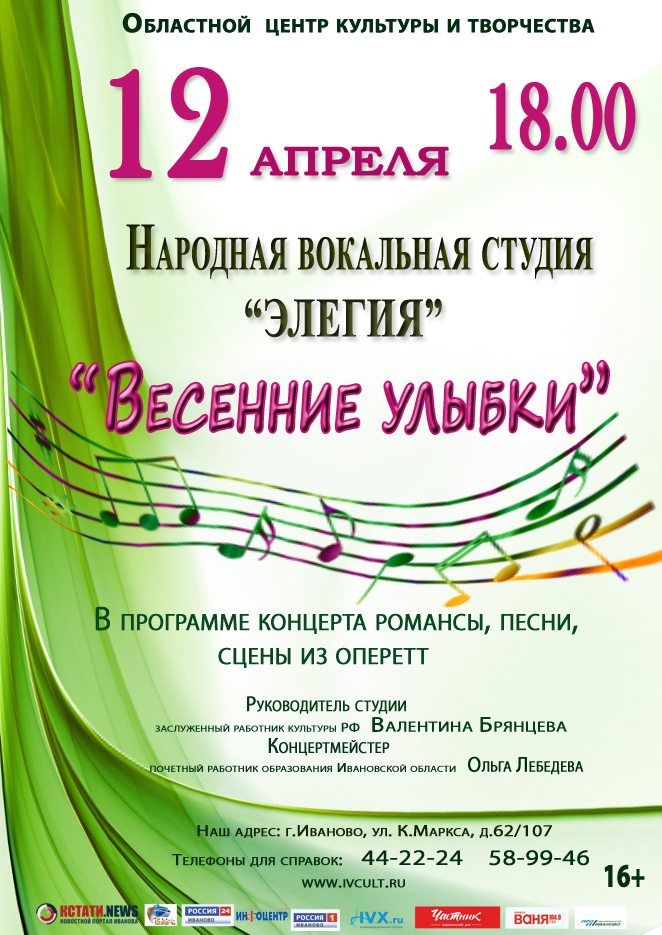 12 апреля в 18.00 в зале областного центра культуры и творчества состоится сольный концерт «народной» вокальной студии «Элегия» «Весенние улыбки». Руководитель студии - заслуженный работник культуры РФ Брянцева В.К., концертмейстер - заслуженный работник образования Ивановской области Лебедева О.Б.