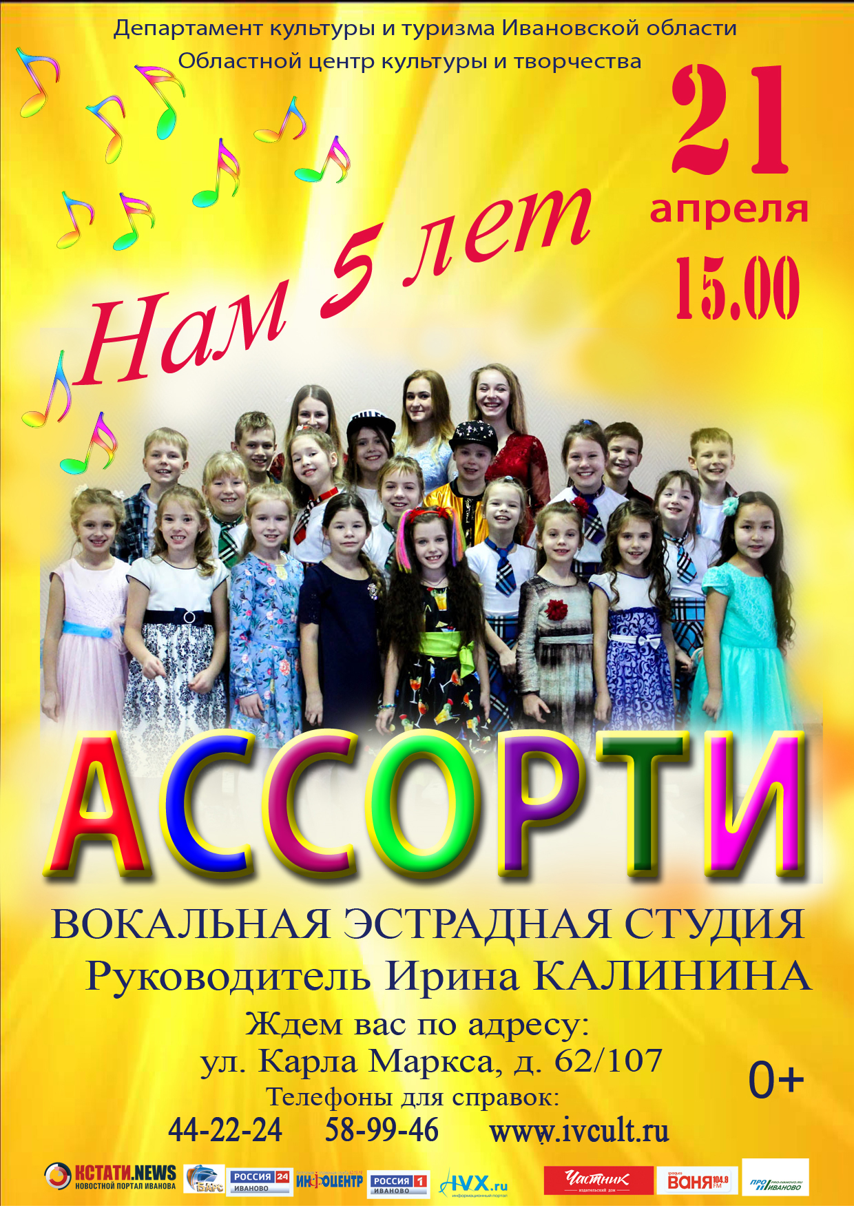 21 апреля в 15.00 в областном центре культуры и творчества пройдет сольный концерт эстрадной вокальной студии «Ассорти», которая отмечает 5-летие со дня основания. Создатель и руководитель студии - Ирина Калинина.