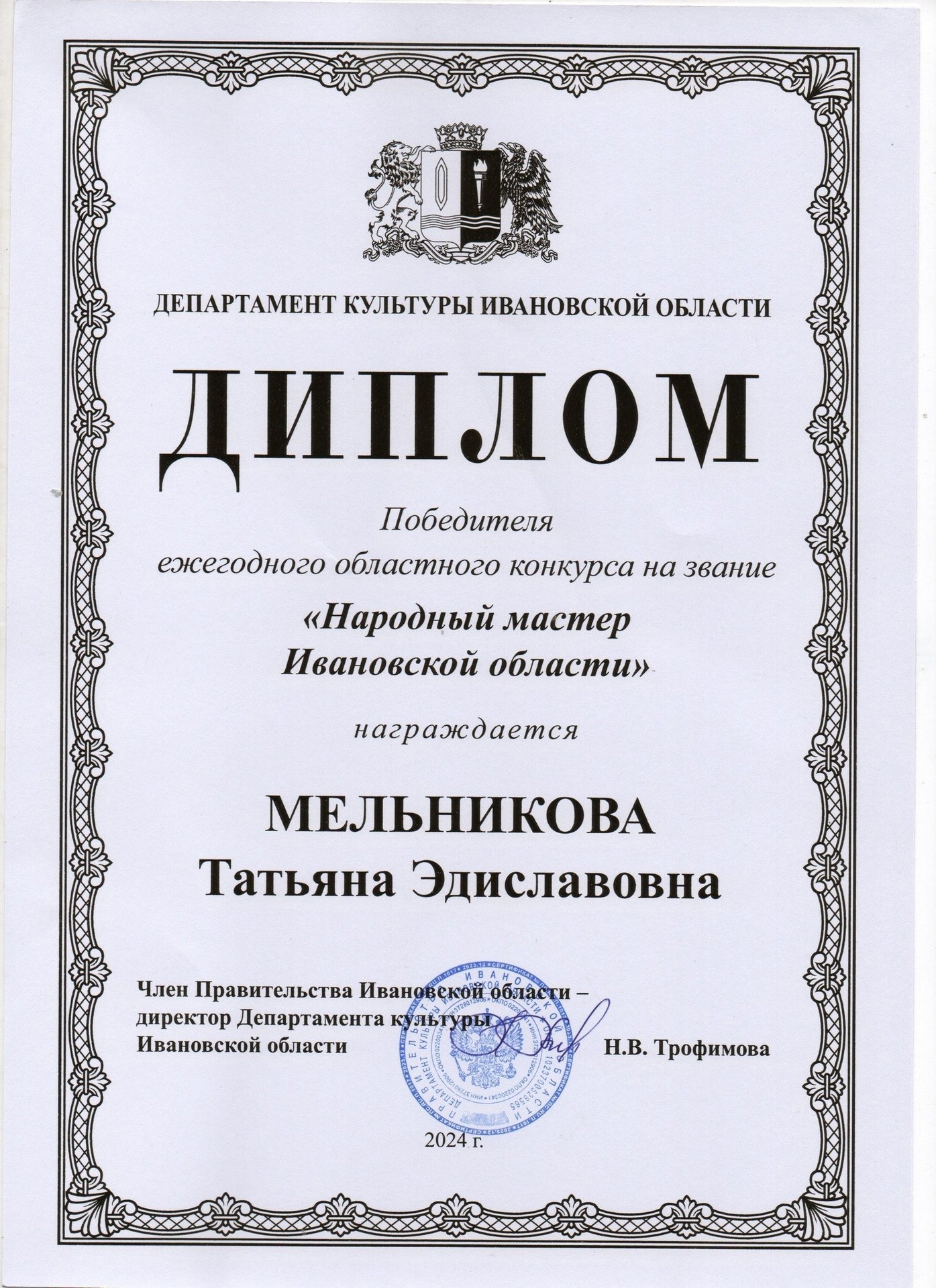 Звание «Народный мастер Ивановской области» получено в 2024 году.