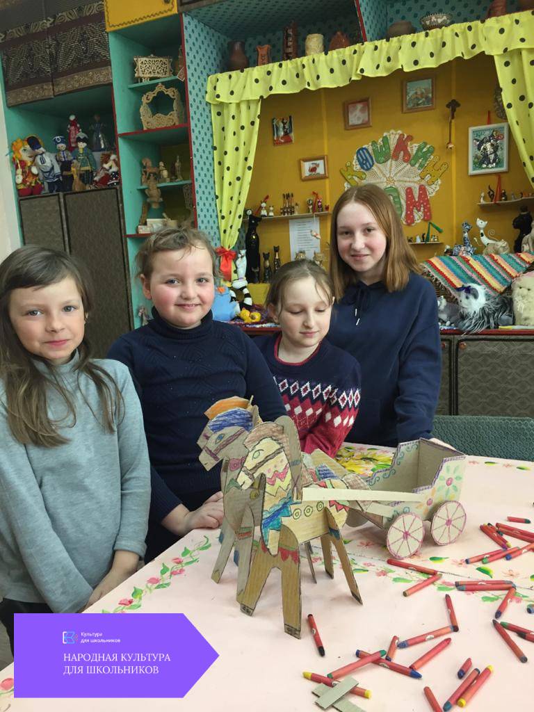 В Васильевском Доме ремёсел Шуйского района прошёл #фолкурок, на котором школьницы вместе с мастером М.Б. Литяйкиной изучили традицию езды на конях в упряжи и смастерили русскую тройку с упряжкой из картона.